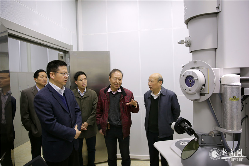西安市副市長方光華(左一)一行在校黨委書記潘中偉(右一)等的陪同下參觀協同創新中心實驗室