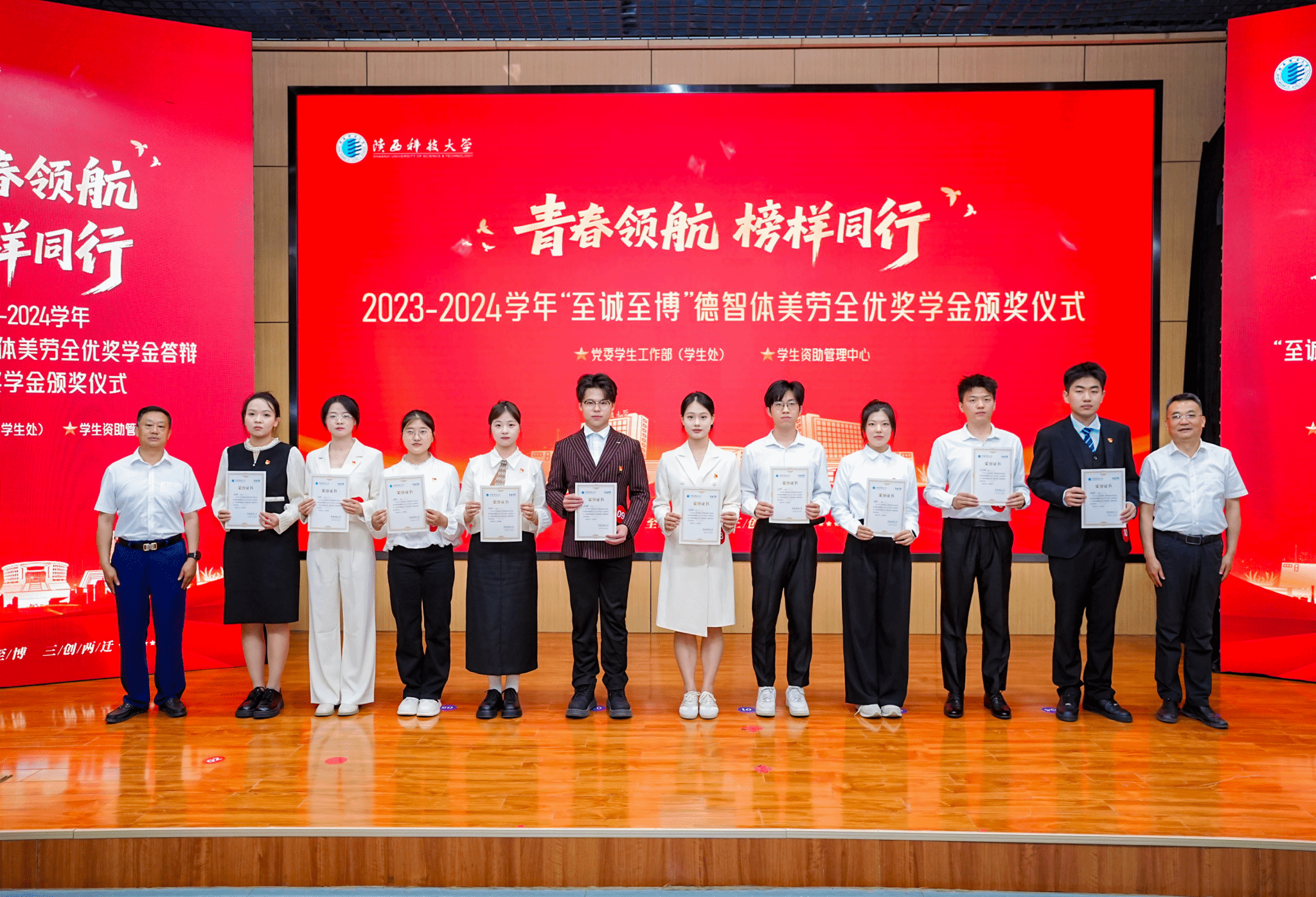 5月27日,陜西科技大學2023—2024學年“至誠至博”德智體美勞全優(yōu)獎學金答辯暨國家獎學金頒獎儀式在圖書館學術(shù)報告廳舉行。黨委書記樊建武、校長黃劍鋒、黨委副書記李學軍出席活動,為10名“至誠至博”全優(yōu)獎學金獲得者和62名國家獎學金獲得者頒獎。