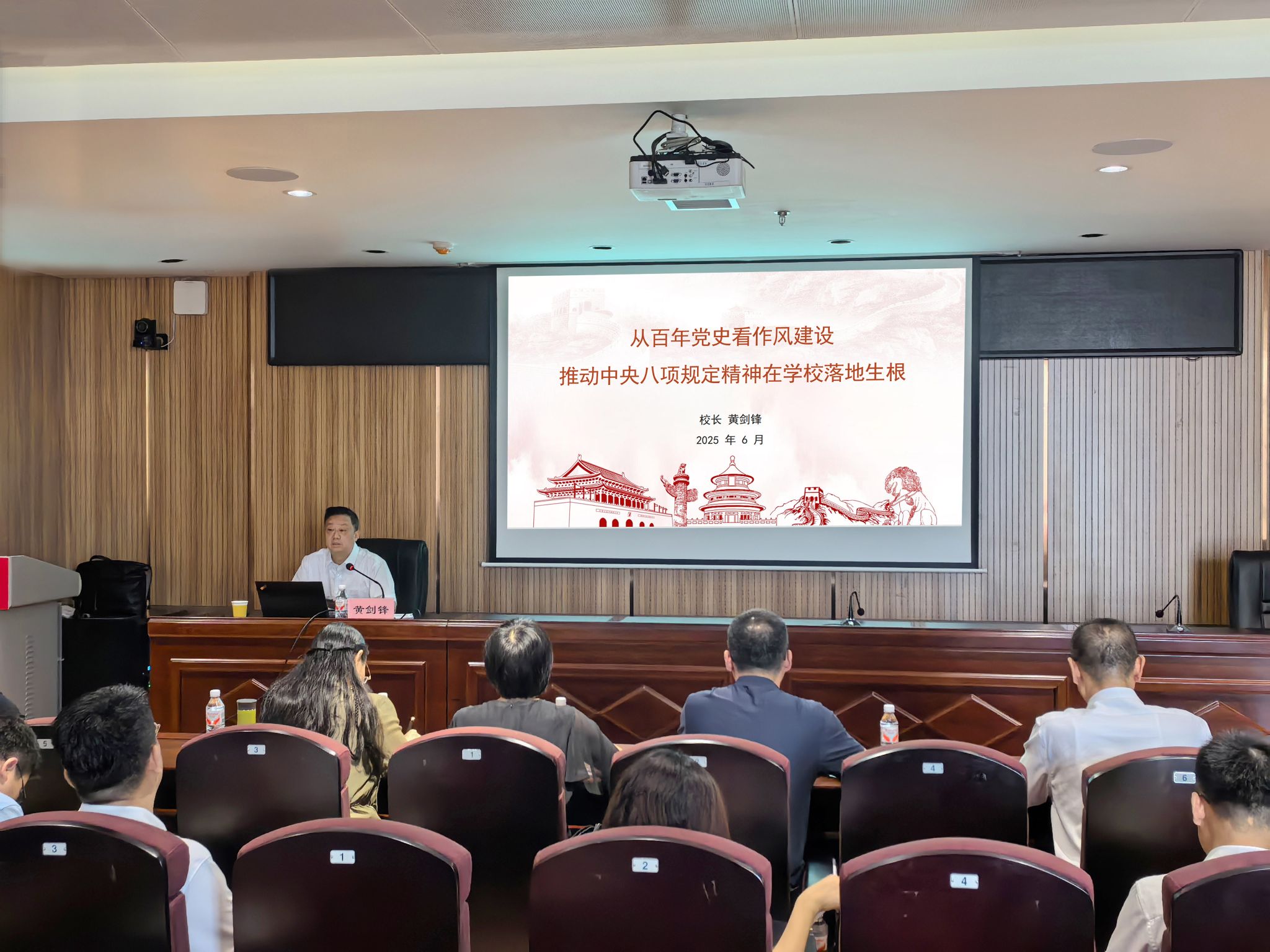 6月20日,黨委副書記、校長黃劍鋒以《從百年黨史看作風建設,推動中央八項規定精神在學校落地生根》為題,為分管(聯系)單位黨員領導干部和教務處黨支部黨員講授作風建設專題黨課。