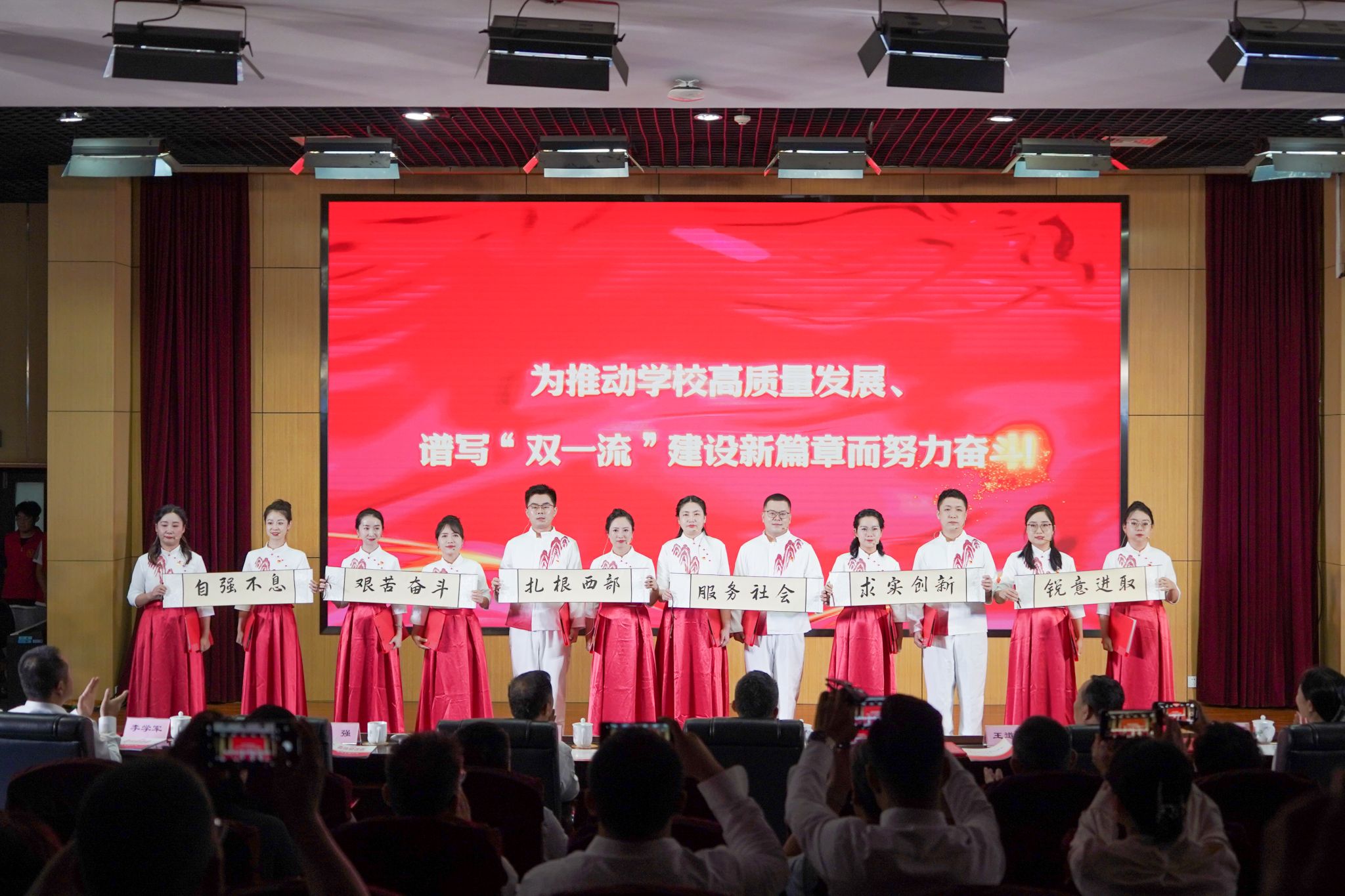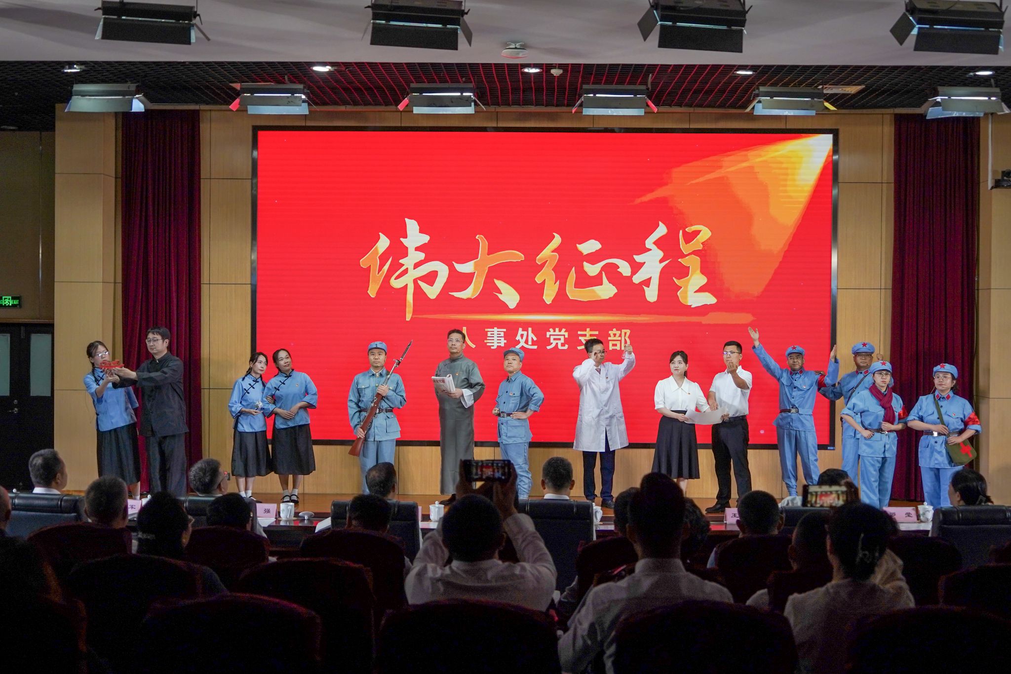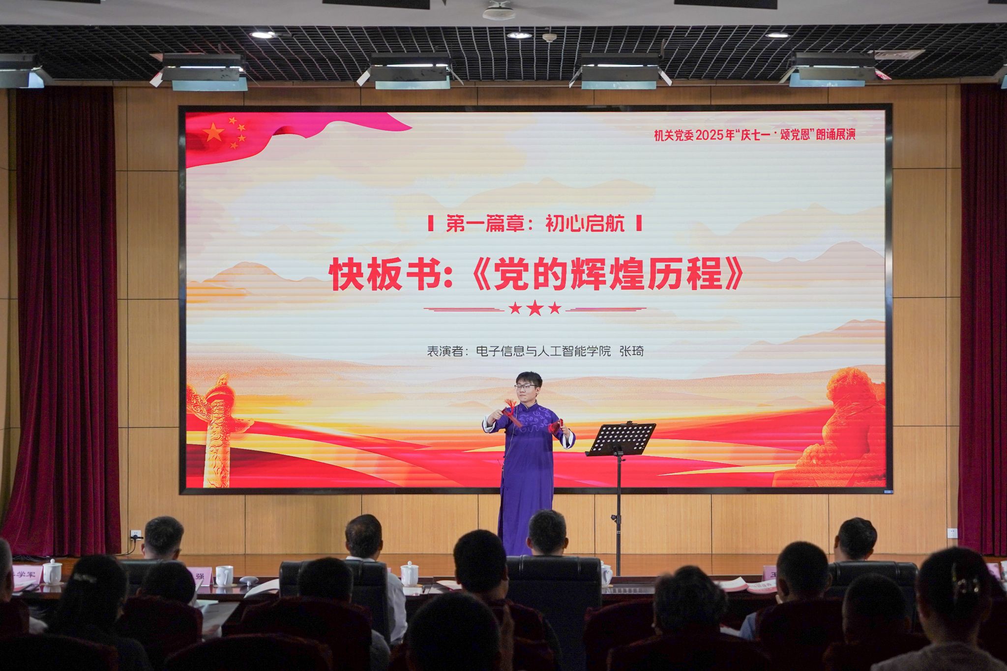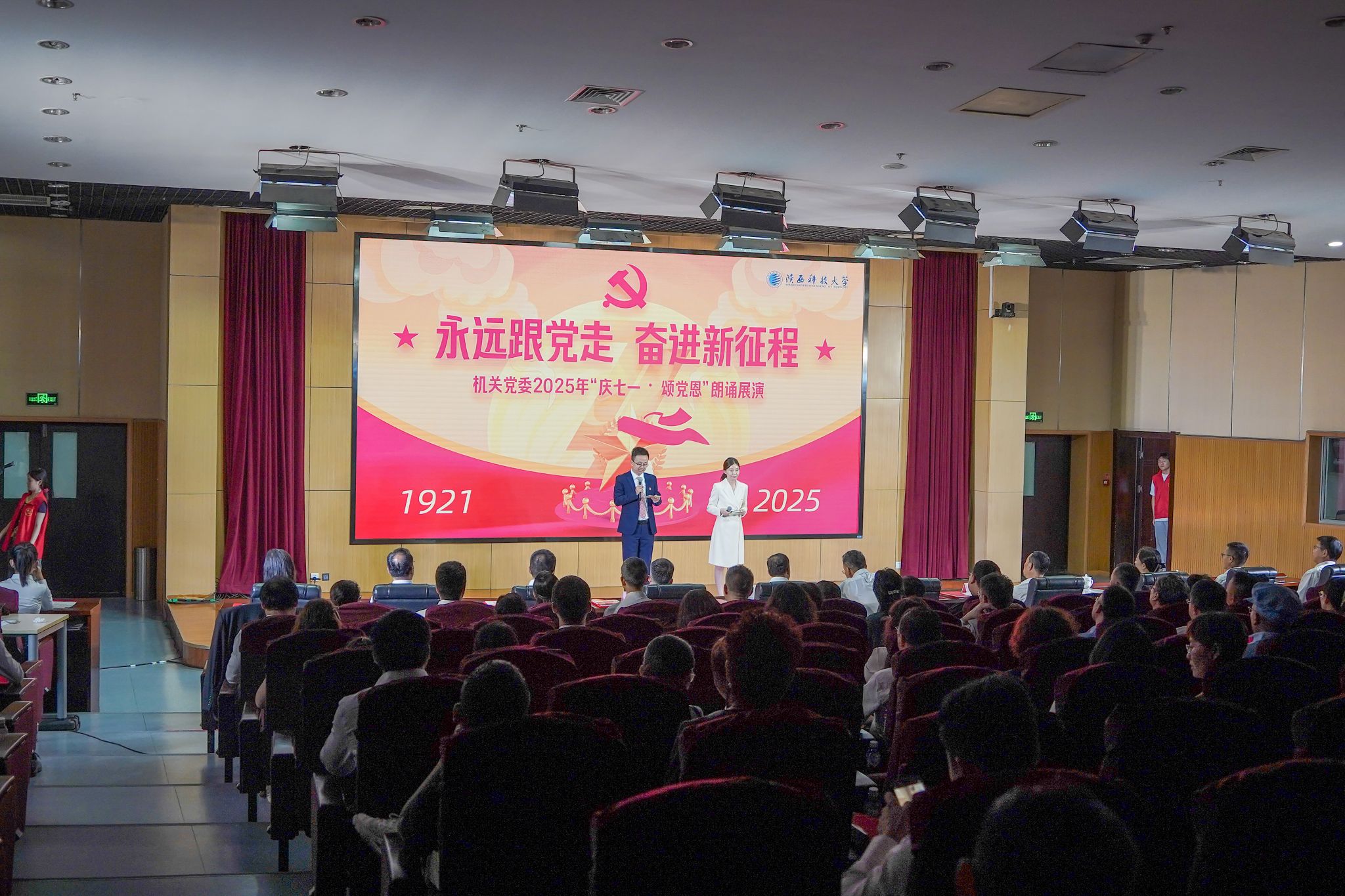 本次展演以“永遠跟黨走 奮進新征程”為主題,分為“初心啟航”“砥礪前行”“時代新章”三個篇章。全體校領導朗誦的原創作品《紅色基因永相傳》,結合學校“三次創業、兩次搬遷、一次劃轉”的奮斗與輝煌,全面回顧了學校紅色基因來源、傳承和發揚之路,昭示信仰力量代代相承;科技處、前沿院、農研院黨支部的《星火燎原》,以鏗鏘之音再現革命火種燎原之勢;研究生院黨支部的《紅船從南湖起航》,引領觀眾回溯夢想起點,感悟紅船精神之源;校友辦、工會、黨辦校辦、組織部黨支部的《可愛的中國》,飽含深情地抒發了對祖國母親的無限摯愛;教務處黨支部的《七月頌》,以激昂詩行回溯黨從南湖紅船到復興巨輪的壯闊征程;人事處黨支部的《偉大征程》,生動展現黨帶領人民取得的歷史性成就;宣傳部、博物館、招生辦黨支部的《永遠跟你走》,用層層遞進的誦讀傳遞“黨指向哪里、我們就奔赴哪里”的赤誠信念;國際處、學科辦、發展規劃處、實驗室與設備管理處黨支部的《輕工鑄魂映黨心——陜科大“三創兩遷”頌》,講述了陜科大黨員干部在平凡崗位上踐行初心使命的感人故事;紀監、審計處黨支部的《三色經緯鑄防線》,結合本職工作展現共產黨員的責任擔當;財務處黨支部的《紅船領航百年路,三創兩遷啟新途》,展現了陜科大人扎根西部、服務國家發展的嶄新篇章;信息中心黨支部的《紅色電波·智慧傳承——從延安到AI時代的信仰之路》,彰顯了紅色通信精神在數字時代的薪火相傳。此外,機關工會代表還合唱《把一切獻給黨》,大學生藝術團合唱《唱支山歌給黨聽》和表演快板書《黨的輝煌歷程》。