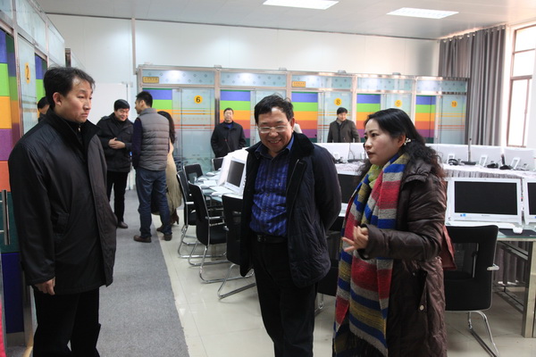 省教育廳語言文字工作處副處長劉白燕(右一)在副校長姚書志(右二)等陪同下在我校計算機輔助普通話水平測試站現場考察