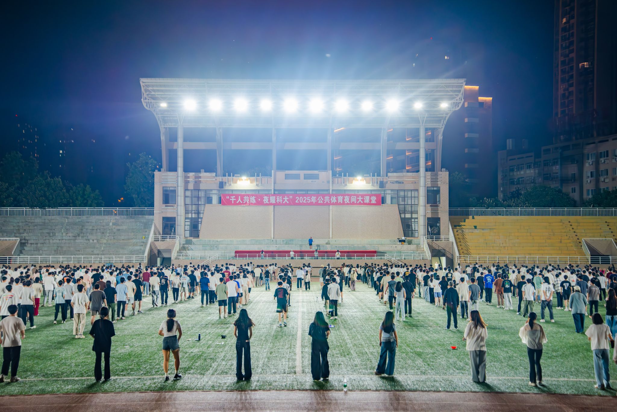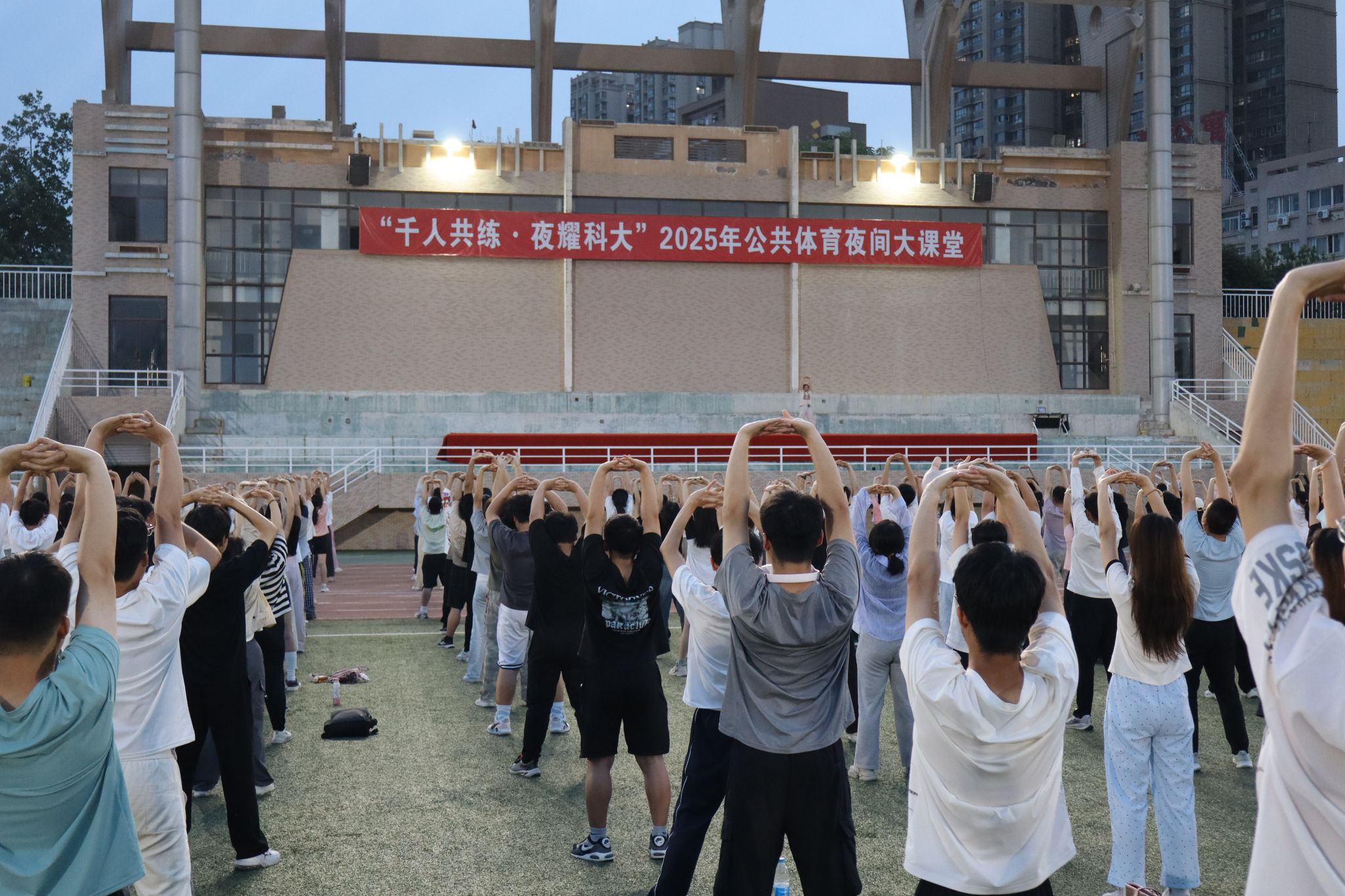 為深入貫徹“健康第一、五育并舉”的教育理念,強化課堂教學在體育育人中的核心作用,通過課堂教學引導學生積極參與運動、感受運動樂趣、養成運動習慣,體育部于5月12日正式推出“千人共練?夜耀科大”2025年公共體育夜間大課堂。大課堂開設在學校標準田徑場,采取體育教師領操、其他教師輔助,學生集體參與跳操的組織形式,課堂教學分為八段錦和健身操兩個環節,并全程配以專業運動音樂,每晚有近2000名學生參與到體育大課堂教學活動中來,整個夜間大課堂將持續兩周時間。