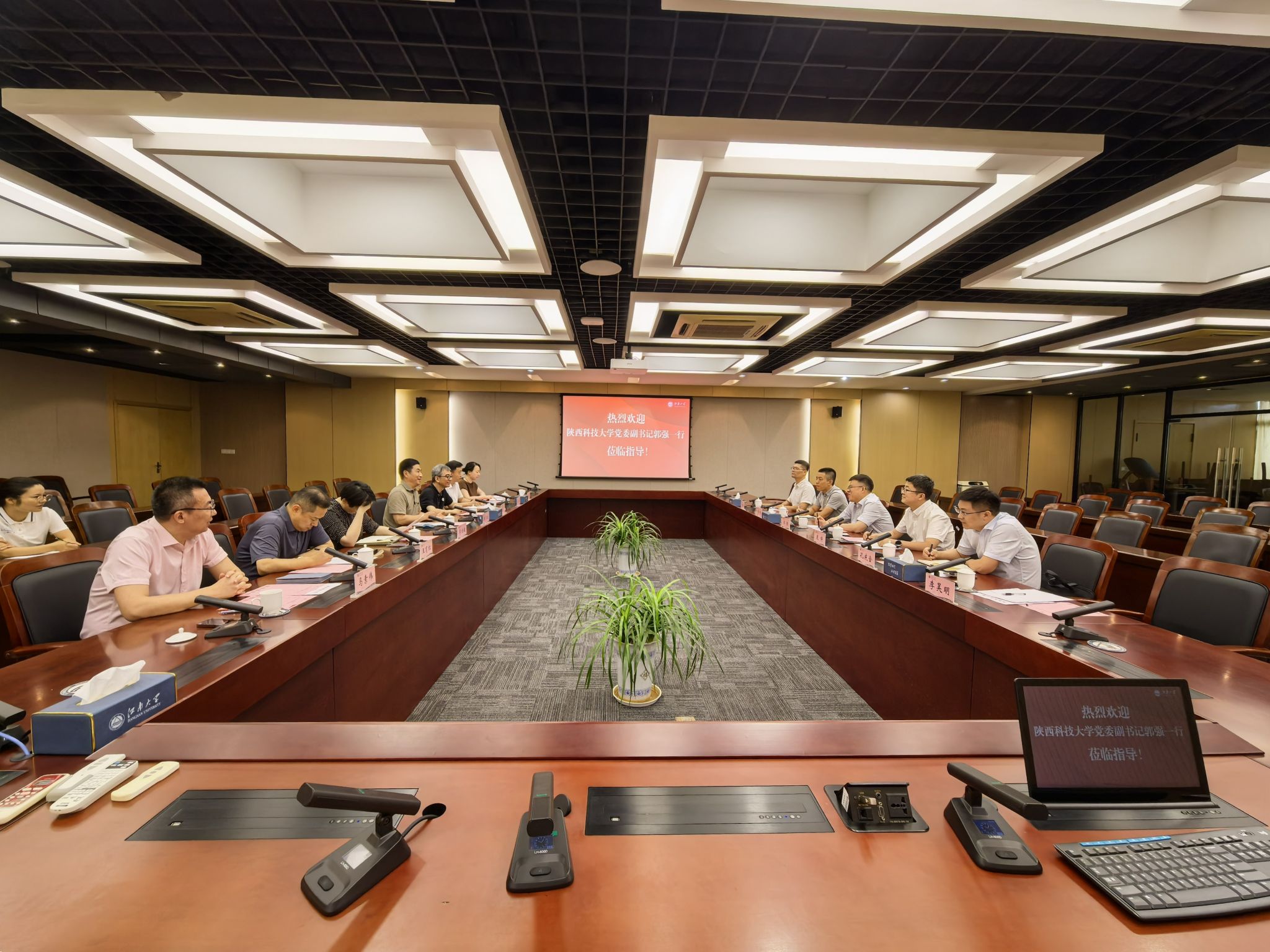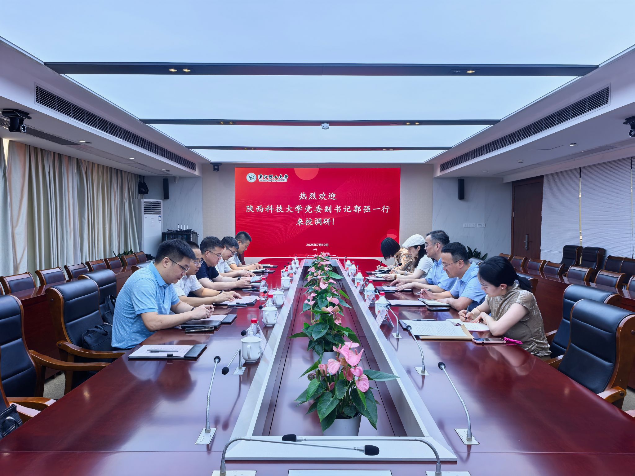 調研交流期間,江南大學副校長戴月波、浙江理工大學副校長姚菊明對郭強一行的到來表示熱烈歡迎。與會同志圍繞“十四五”總結評估、“十五五”規劃編制、高校治理體系和治理能力現代化實踐、校園文化品牌建設、數字化建設及AI校園場景應用等方面進行深入探討,并表示希望進一步加強合作,共同推動學校教育事業再上新臺階。