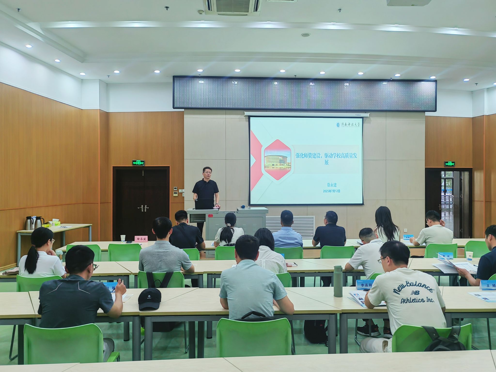 教師發(fā)展中心常務(wù)副主任徐永建作題為《強(qiáng)化師資隊(duì)伍建設(shè),驅(qū)動(dòng)學(xué)校高質(zhì)量發(fā)展》開(kāi)班動(dòng)員講話。報(bào)告立足新時(shí)代教育強(qiáng)國(guó)建設(shè)背景,從教育、科技、人才“三位一體”戰(zhàn)略高度,深入分析師資隊(duì)伍建設(shè)的戰(zhàn)略意義,詳細(xì)解讀了學(xué)校“三步走”發(fā)展規(guī)劃,系統(tǒng)闡述“至誠(chéng)計(jì)劃”、“至博計(jì)劃”、“卓越計(jì)劃”等教師培養(yǎng)體系的具體舉措與實(shí)施成效,為新進(jìn)教師職業(yè)發(fā)展指明方向。