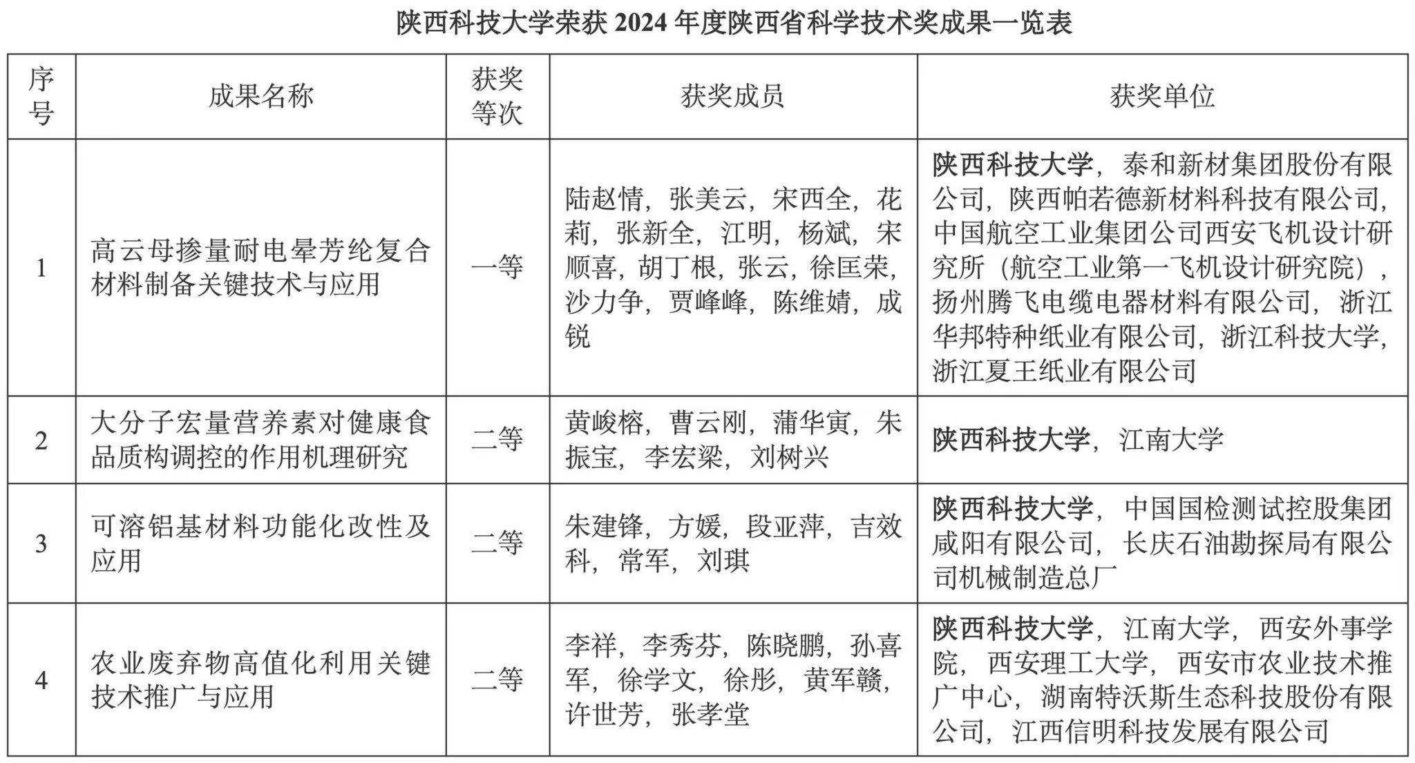 近日,中共陜西省委、陜西省人民政府發布《關于2024年度陜西省科學技術獎勵的決定》(陜字〔2025〕72號),陜西科技大學共6項科研成果獲獎,其中作為主持單位獲一等獎1項、二等獎3項,作為參與單位獲得一等獎1項、三等獎1項。
