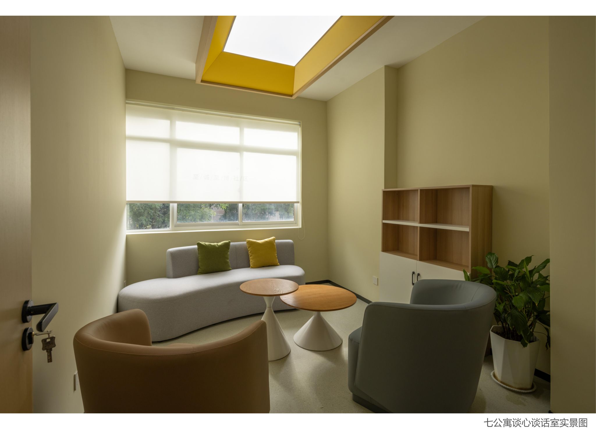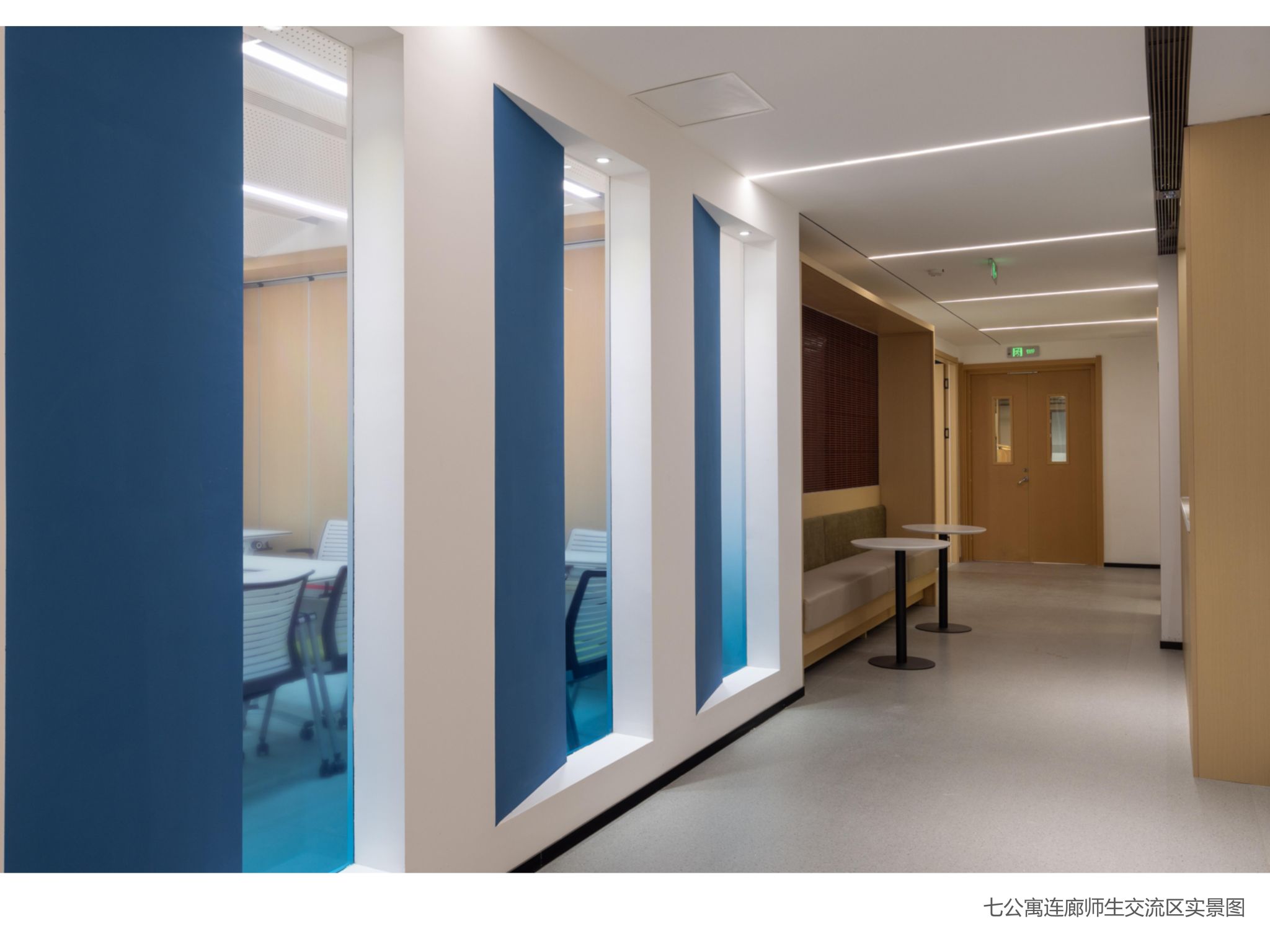 與此同時,學校還將學生七公寓作為“1+N”布局的第一個試點建設社區服務站進行了改造,建成了服務于輔導員入駐、各育人主體下沉和黨團班集體活動的多功能空間。公寓連廊一二層設有4間8個工位的輔導員辦公室,滿足該公寓學生帶班輔導員的入駐辦公需要;一樓大廳外設有開放式黨團班共享會議室,大廳內重新改造裝修,面貌煥然一新,閱讀書柜、舒適沙發一體配備,成為學生日常休憩、互動交流的新空間;連廊二樓專門外加鋼構樓梯,實現動線獨立分流,為各班級集中開展活動提供便利的專用通道,內設有研討區、學生等待休息區,建有黨團班活動室,多媒體互動屏、移動桌椅一應俱全,折疊門可以根據使用人數靈活調整空間大小,既能承載兩個班體量的大規模集體活動,也能適應小范圍的小組討論,實現了空間利用最大化,也為學校各育人力量進公寓開展工作提供了場地及設備保障;談心談話室精心建設,舒適的沙發、溫暖的墻面配色,為師生咨詢談話提供了私密、安靜、舒適的空間。社區服務站的試點建成為我校推動各育人力量下沉社區,輔導員及時響應學生訴求、就近就便開展教育管理服務工作,推進"服務到樓、關懷到人"理念落實,實現"小事不出樓宇,大事不出社區"目標提供了空間環境保障。