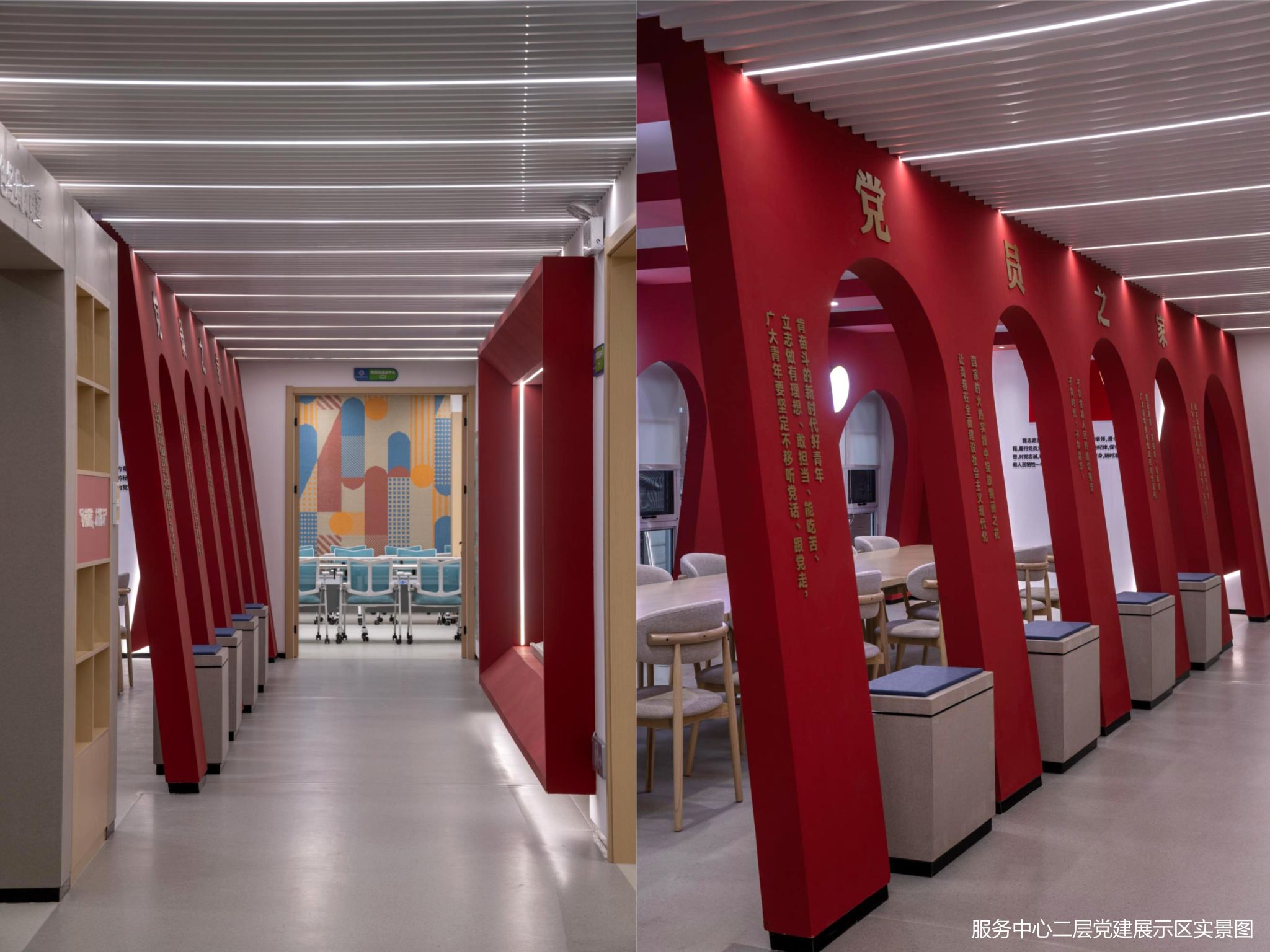 中心注重突出黨建引領的思政育人功能,在二樓建成了黨員之家、紅色經典閱覽室、輔導員之家和若干黨團班活動室。黨員之家以窯洞為造型,寓意傳承和弘揚延安精神,迎面懸掛黨旗、鐫刻入黨誓詞,立柱展示中國共產黨人精神譜系的偉大精神,沉浸式環境涵養紅色基因;輔導員之家將系統展示我校輔導員隊伍建設的思路、成果及成效,服務我校輔導員隊伍研學研討,推動隊伍職業化專業化發展;紅色經典閱覽室配備系列黨的歷史與黨建方面書籍,服務廣大黨員閱讀研討紅色經典;輔導員之家、紅色經典閱覽室、黨員之家空間聯通,充分體現了思想政治工作學與做、教與學的知行合一與育人主旨;黨團班活動室設有兩個,一個可容納70余人共同使用,并可以隨時關閉隔離門分割為兩個互不干擾的獨立活動室使用,另一個可容納近60人共同使用,全部配備自由移動桌椅和電子屏幕,為學生黨支部、團支部及班級活動開展提供可容納不同人數的空間場地和賦能增效的現代化設施支持,服務黨團班探索開展高質量、沉浸式、互動性集體活動。