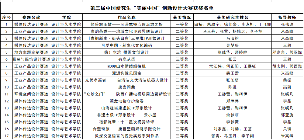 近日,由教育部學位與研究生教育司指導,中國學位與研究生教育學會、中國科協青少年科技中心主辦的第三屆中國研究生“美麗中國”創新設計大賽全國總決賽在黑龍江大學舉行。經激烈角逐,我校研究生團隊斬獲國家級獎項17項,其中,一等獎1項、二等獎3項、三等獎13項,1名教師獲優秀指導教師。獲獎數量與質量均刷新我校參賽紀錄,創下該賽事全國總決賽歷史最佳成績。