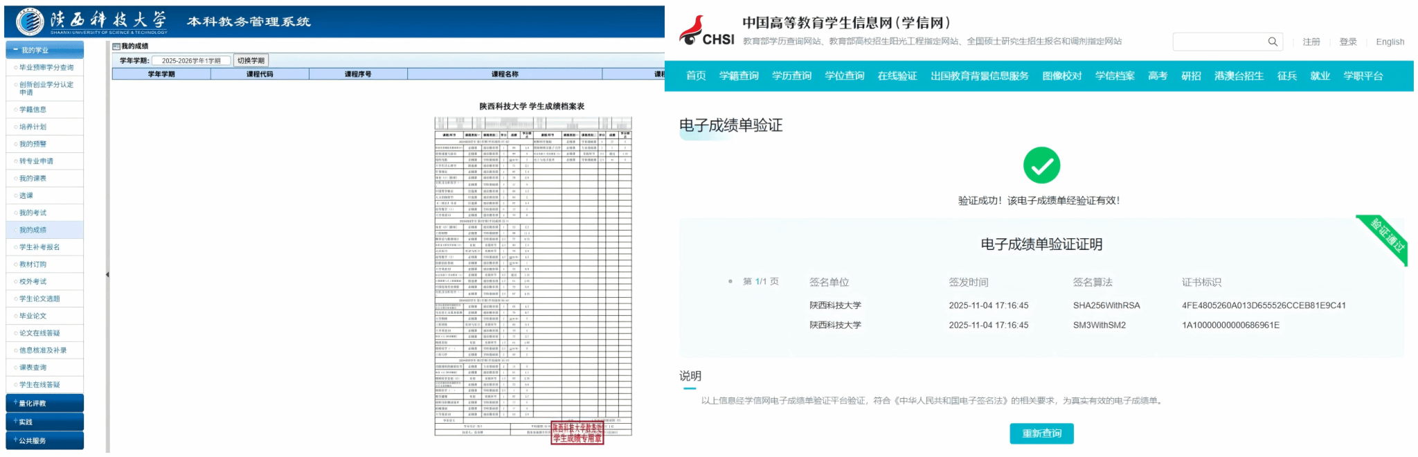 推行電子簽章,優化師生服務體驗。為進一步優化師生辦事流程,教務處經過多方調研分析論證,于本學期上線本科生中英文電子簽章業務,實現成績單等材料的線上申請、自動審批與電子交付。學生提交申請后,系統自動加蓋電子簽章并生成驗證碼,形成“電腦受理、電子流轉、自動出證”的審批服務閉環。該項服務支持學信網真實性核驗,有效推動業務辦理“無紙化、網絡化”,真正實現“數據多跑路、師生少跑腿”,全面提升服務效率與用戶體驗。