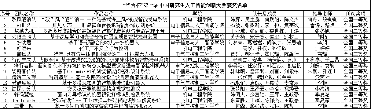 10月28日至30日,由教育部學位管理與研究生教育司指導,中國學位與研究生教育學會、中國科協青少年科技中心主辦的“華為杯”第七屆中國研究生人工智能創新大賽全國總決賽在青島舉行。我校研究生團隊斬獲16項國家級獎項,其中一等獎1項、二等獎5項、三等獎10項,獲獎質量同比提高。同時,我校再次榮獲優秀組織單位獎,電氣與控制工程學院何舟、段銳銳獲優秀指導教師稱號。