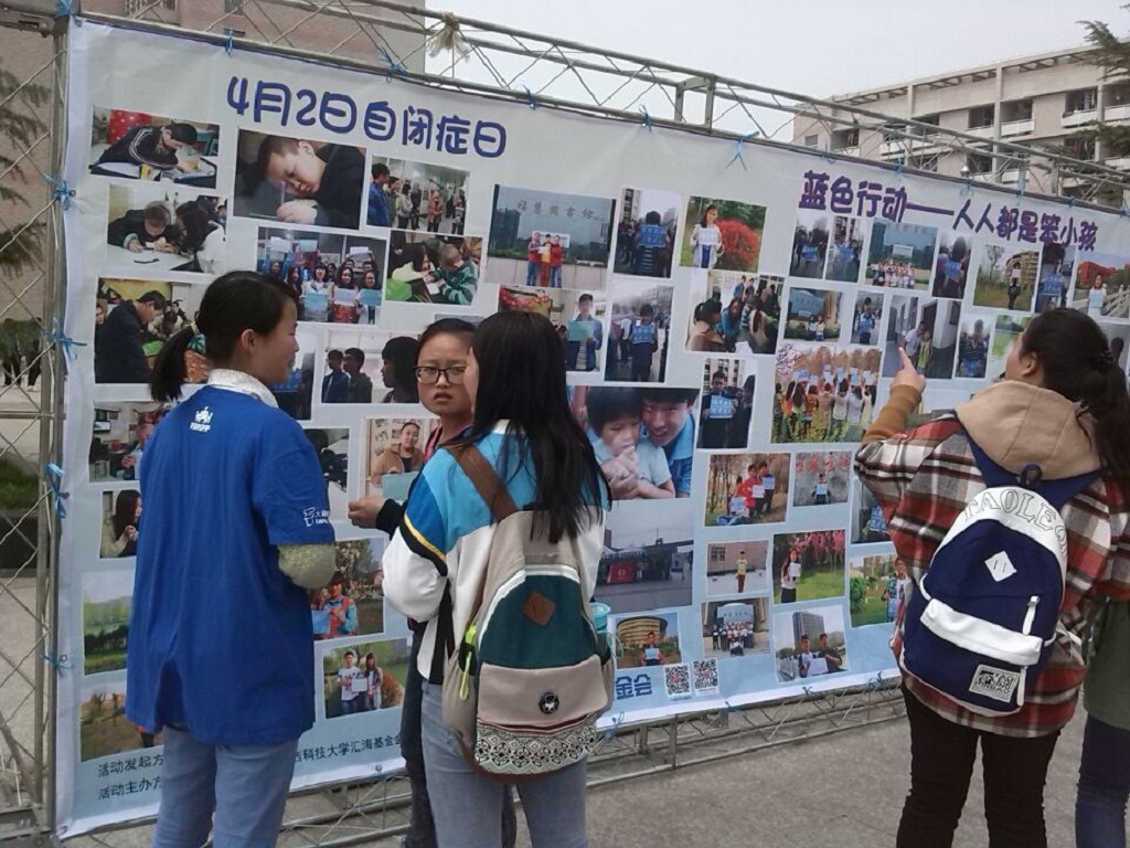 在校內,匯海基金會以全方位、多途徑普及自閉癥知識,引導全校師生關注自閉癥群體;沁園廣場上裝扮的匯集了每一位志愿者祈禱與祝福的照片墻,吸引了來往的同學們駐足觀看;包含了虔誠的寄語的藍色氣球“笨小孩”緩緩升空,送給每一位“星星的孩子”;沁園餐廳的電視上播放了自閉癥的宣傳影片,讓同學們了解自閉癥患者的基本知識。此外,匯?;饡驹刚呓M織學生觀看自閉癥主題電影《海洋天堂》、《雨人》,增加學生對自閉癥兒童的理解。