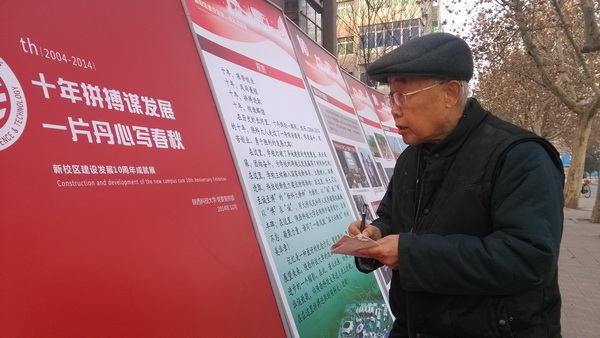 2014年12月25日至2015年1月4日,“十年拼搏謀發展 一片丹心寫春秋——新校區建設發展10周年成就展”先后在西安校區迎賓大道和咸陽校區舉行。展覽凸顯“異地建設速度快,以人為本建住宅,五年清償銀行債”的新校區建設三大特點,通過基本條件建設、人才培養、學科建設與研究生教育、科研成果、校園文化、對外交流和黨的建設7大板塊43塊展板,充分展示了學校主體東移的艱苦創業和改革發展的輝煌成就。展覽期間,包括廣大師生員工和離退休老同志在內的觀展者絡繹不絕,機關黨委、保障黨委、基建處、材料科學與工程學院等單位還組織進行了集體參觀。大家在展板前憶往昔、嘆變化,心潮澎湃,感慨萬千,還有人拿起筆記本詳細記錄,甚至有人流下了激動的淚水。電視專題片《十年拼搏 鑄就輝煌》片段《西安校區建設紀實》片段