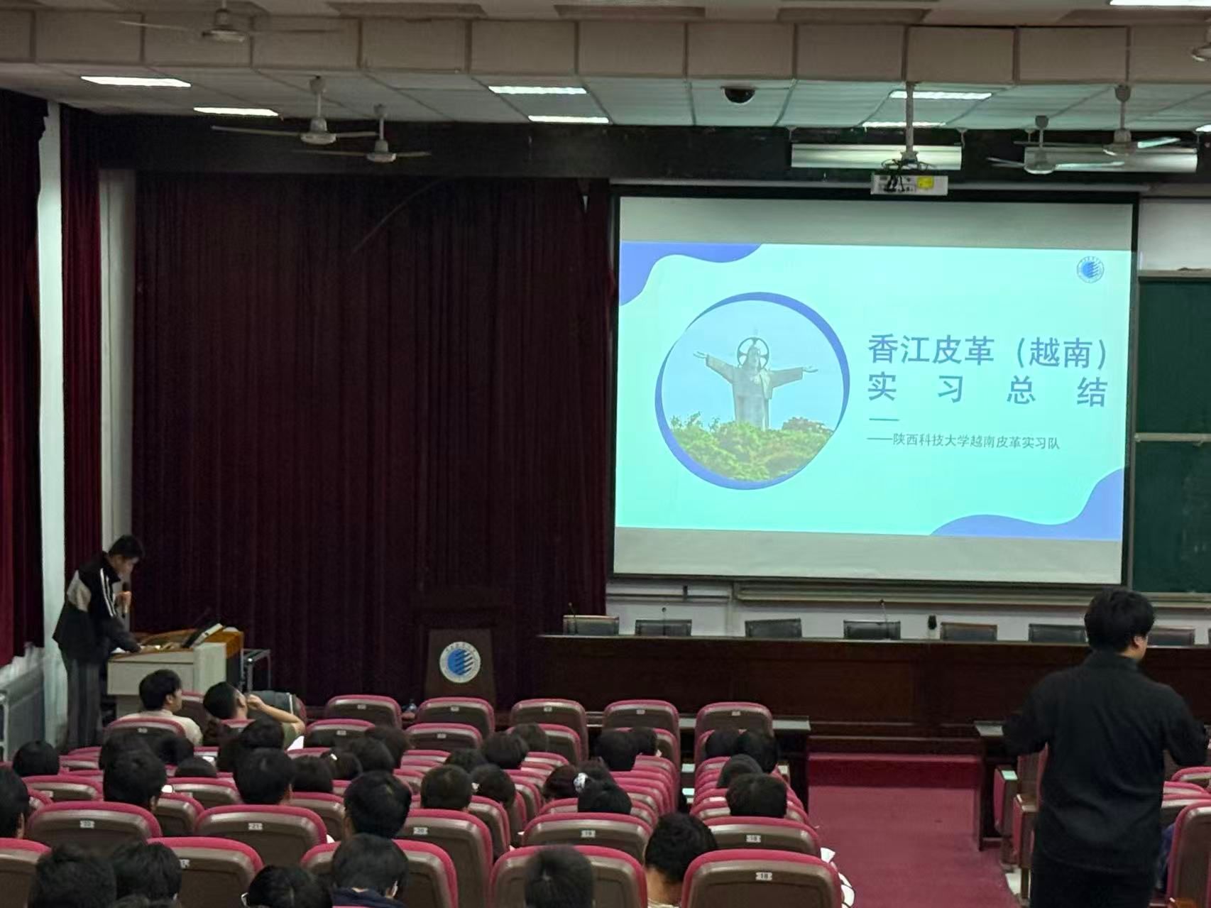 9月24日,陜西科技大學皮革(越南)實習隊在校內舉辦實習總結分享會,給予學院大一新生交流分享赴香江集團(越南)有限公司的實習成果。