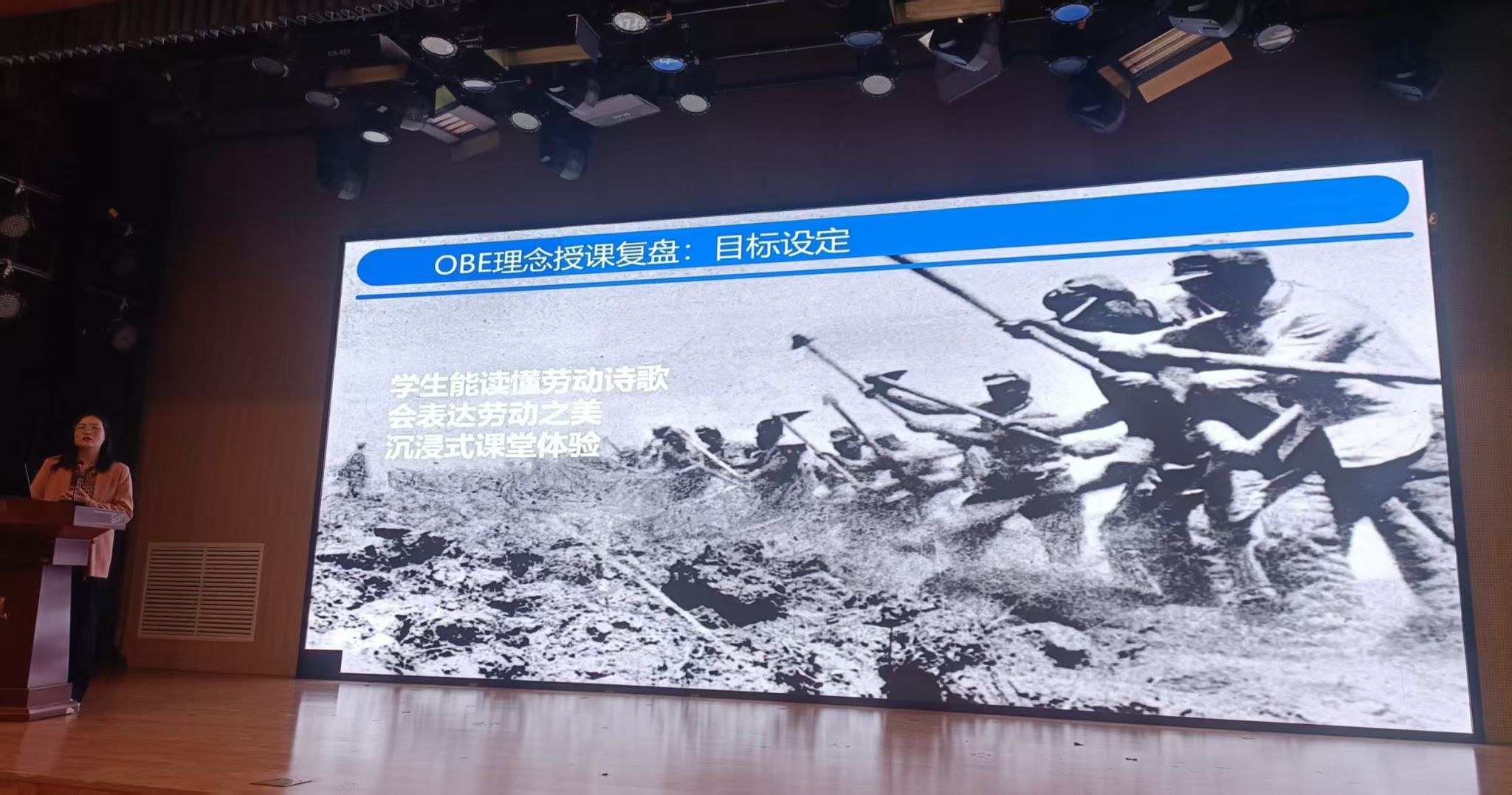 李靜以“抗戰時期的勞動主題詩歌教學及其反思”為切入點,從目標設定、任務清單、OBE理念落地、授課復盤,詳細的分析了教師如何運用理論聯系情景,運用啟發教學法、問題教學法、項目教學法、案例教學法等等,來塑造和提升學生的能力表達,使學生能夠沉浸式體驗課程的魅力。