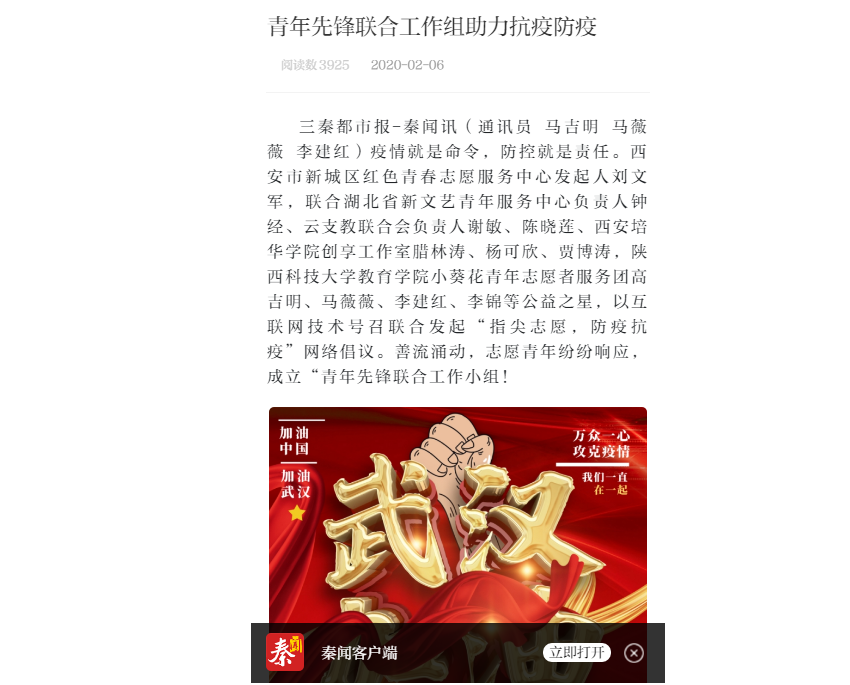 近日,《三秦都市報》APP報道我校年志愿者等成立青年先鋒聯合工作組助力抗疫防疫。