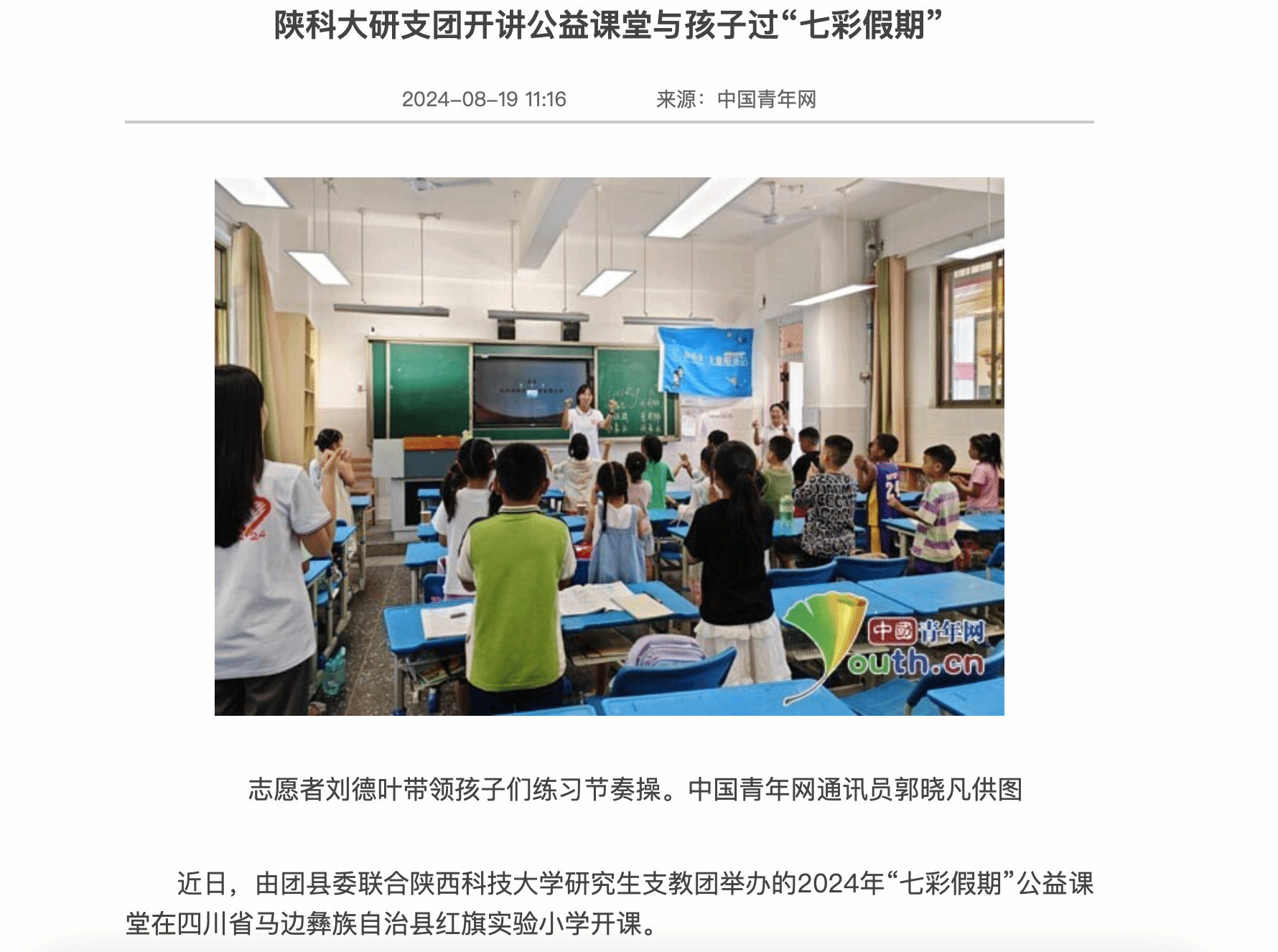 近日,《中國青年網》報道我校研支團開講公益課堂與孩子過“七彩假期”。
