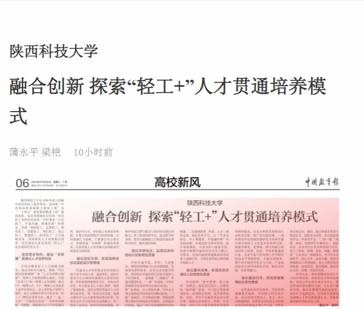 近日,《中國教育報》報道我校融合創新,探索“輕工+”人才貫通培養模式。