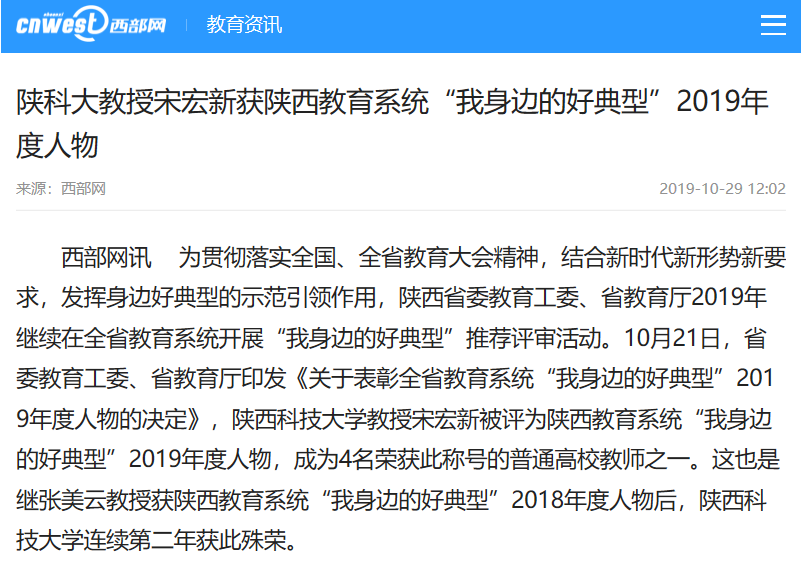 10月29日,《西部網》報道了我校教師宋宏新教授獲陜西教育系統“我身邊的好典型”2019年度人物,全文鏈接如下:http://m.cnwest.com/jyzx/a/2019/10/29/18118402.html