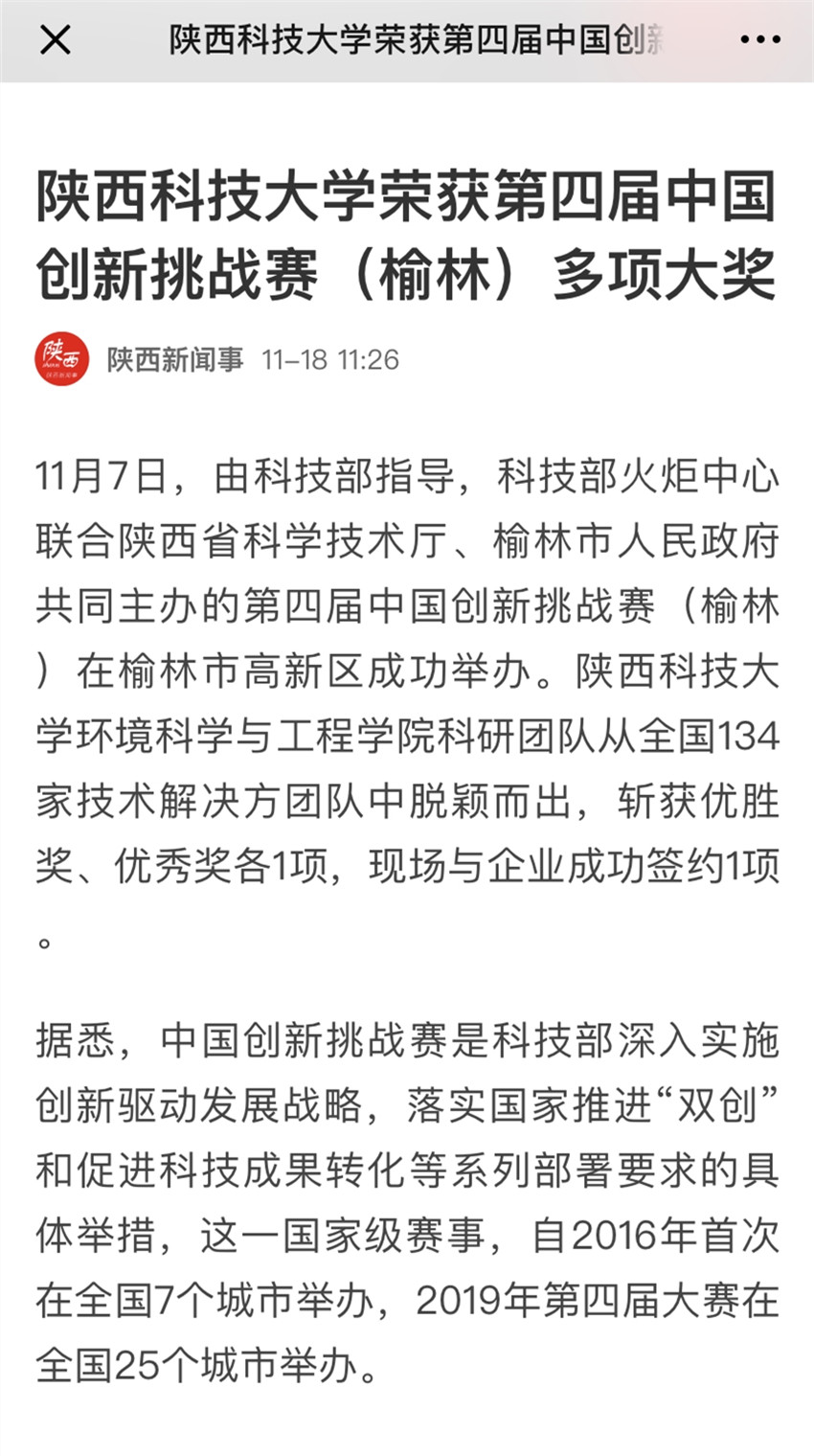 11月7日,由科技部指導,科技部火炬中心聯合陜西省科學技術廳、榆林市人民政府共同主辦的第四屆中國創新挑戰賽(榆林)在榆林市高新區成功舉辦。我校環境科學與工程學院科研團隊從全國134家技術解決方團隊中脫穎而出,斬獲優勝獎、優秀獎各1項,現場與企業成功簽約1項。