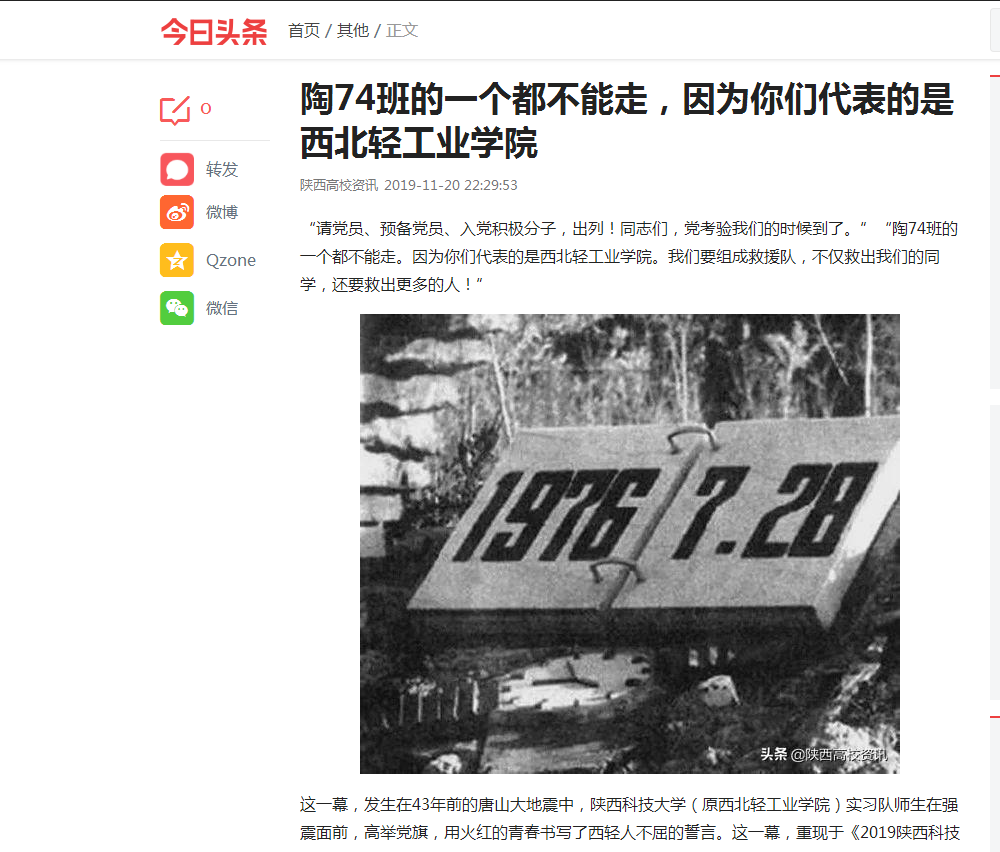 今日頭條APP報道:陶74班的一個都不能走, 因為你們代表的是西北輕工業學院!