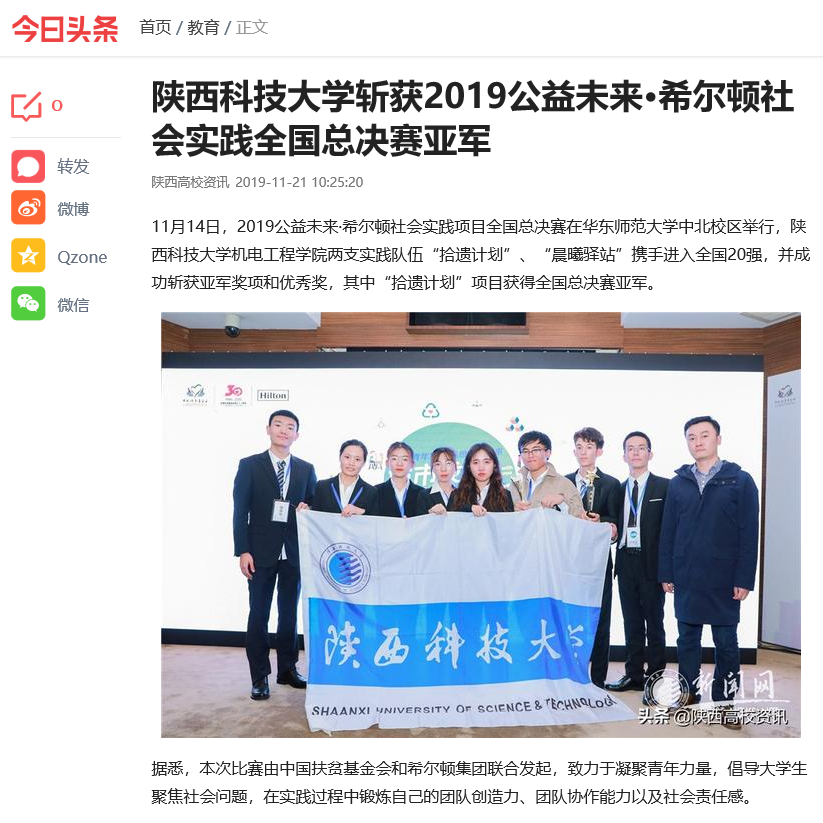 今日頭條:陜西科技大學斬獲2019公益未來·希爾頓社會實踐全國總決賽亞軍