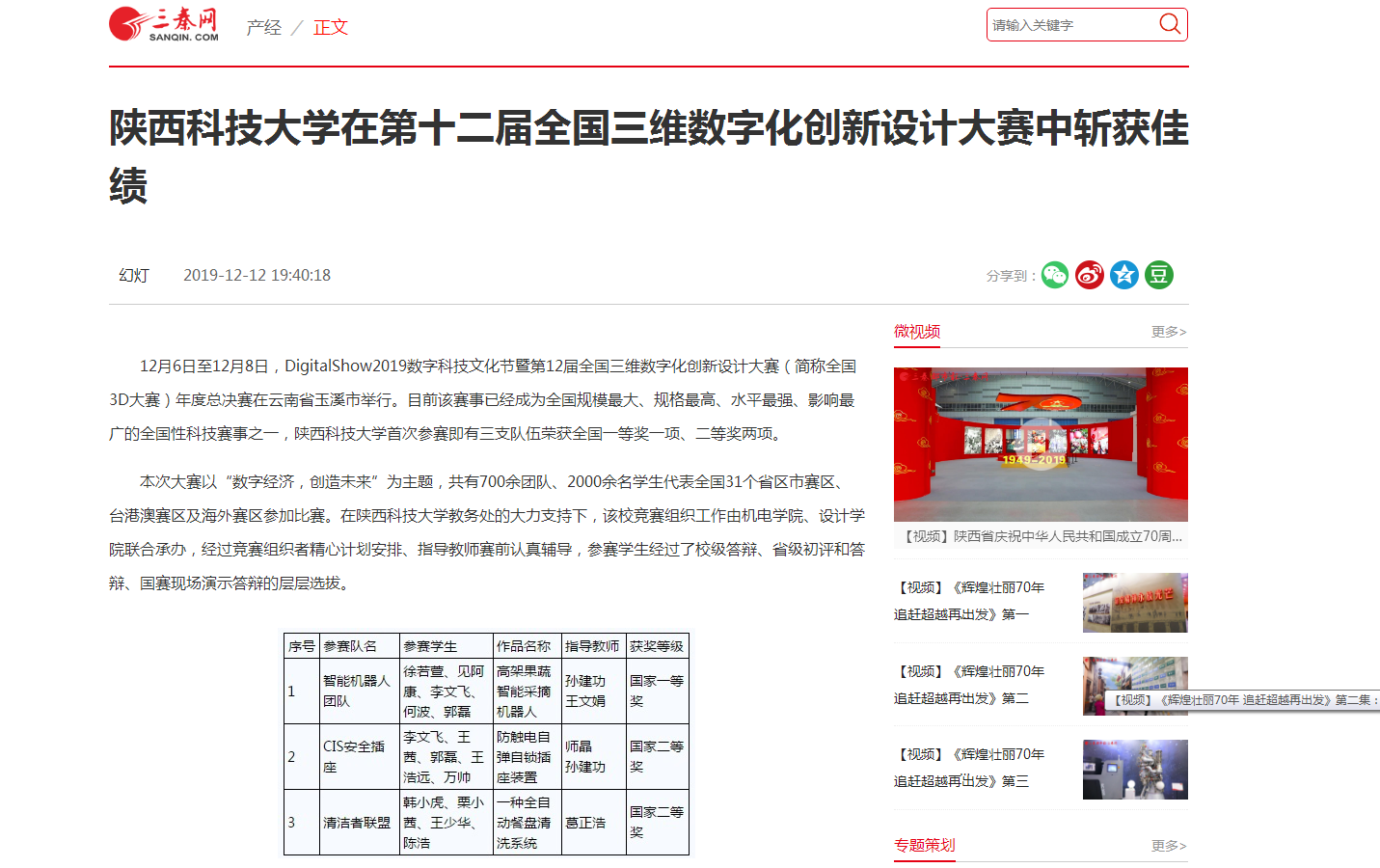 三秦網:陜西科技大學在第十二屆全國三維數字化創新設計大賽中斬獲佳績