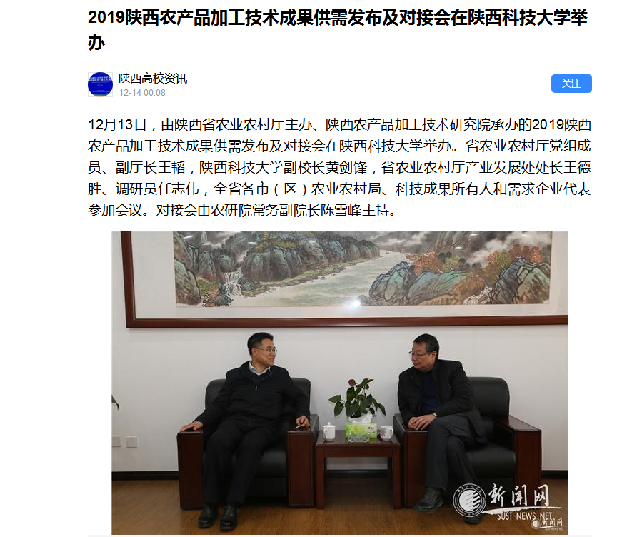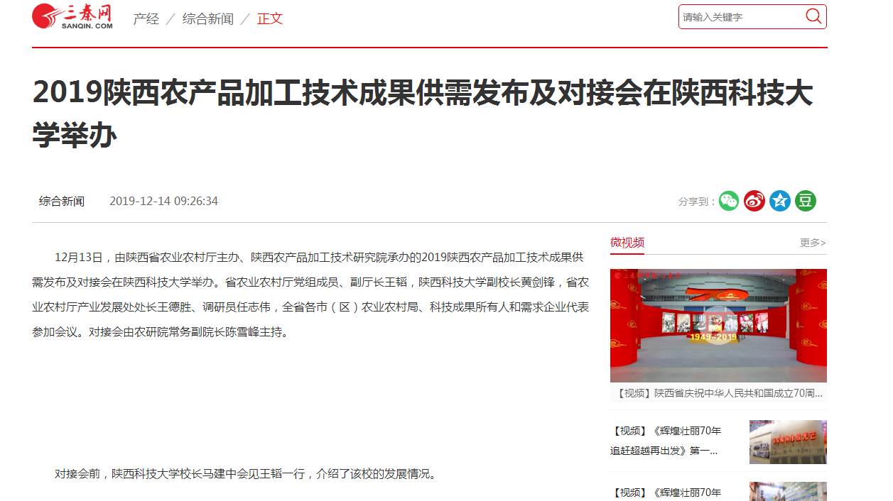 近日,三秦網、百度APP等媒體紛紛報道2019陜西農產品加工技術成果供需發(fā)布及對接會在我校舉辦。