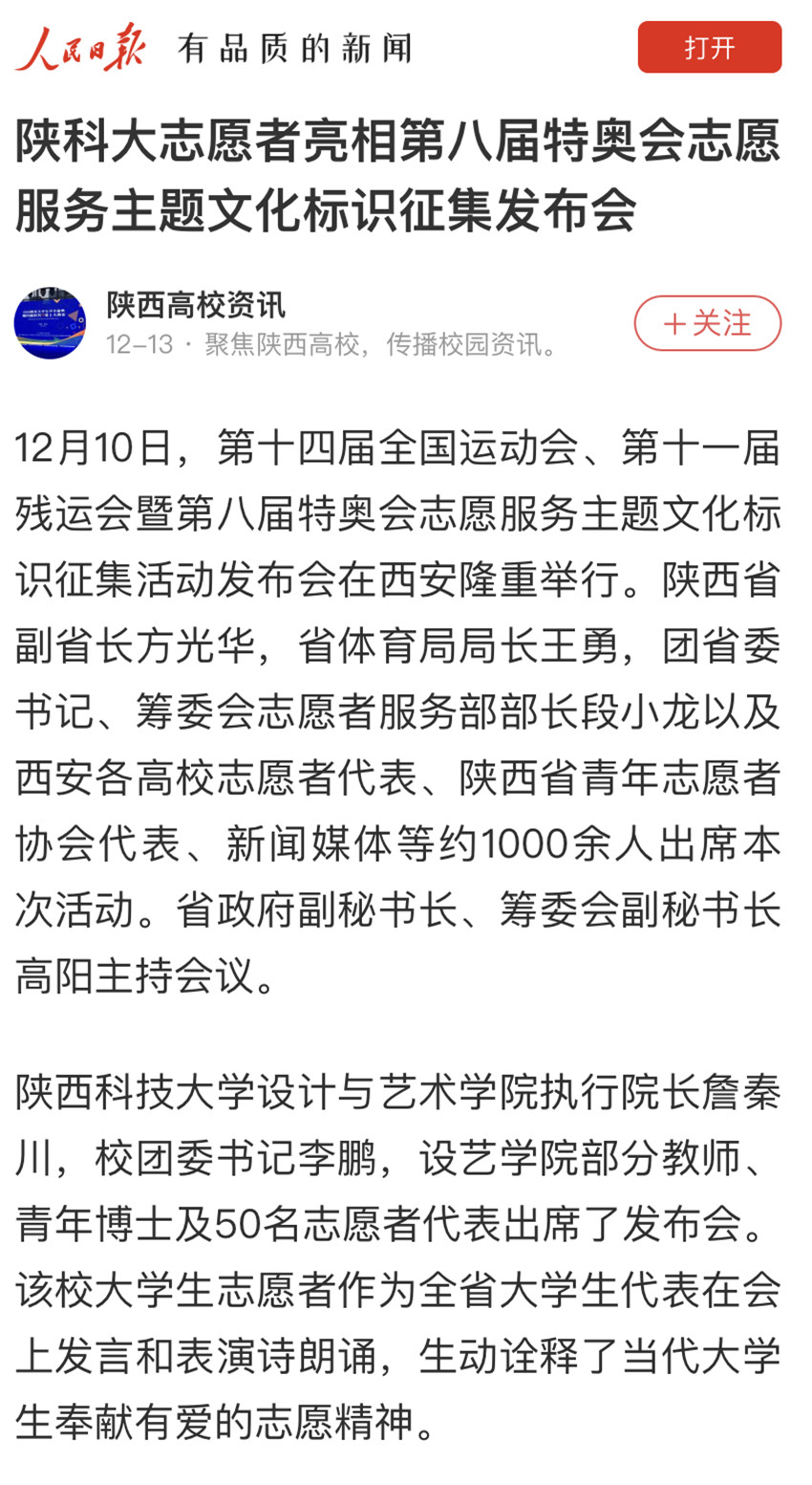 人民日報APP:陜科大志愿者亮相第八屆特奧會志愿服務(wù)主題文化標(biāo)識征集發(fā)布會