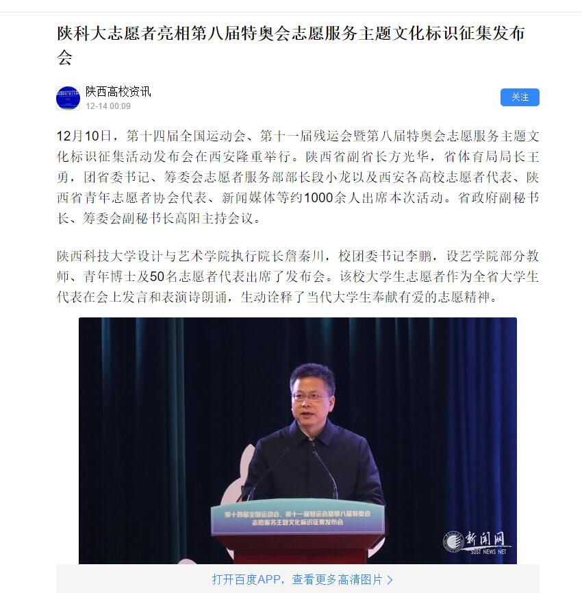 百度APP:陜科大志愿者亮相第八屆特奧會志愿服務(wù)主題文化標(biāo)識征集發(fā)布會
