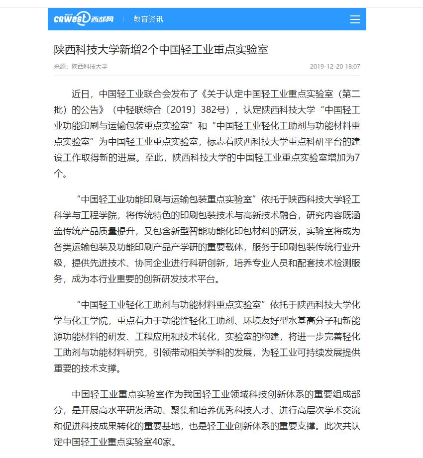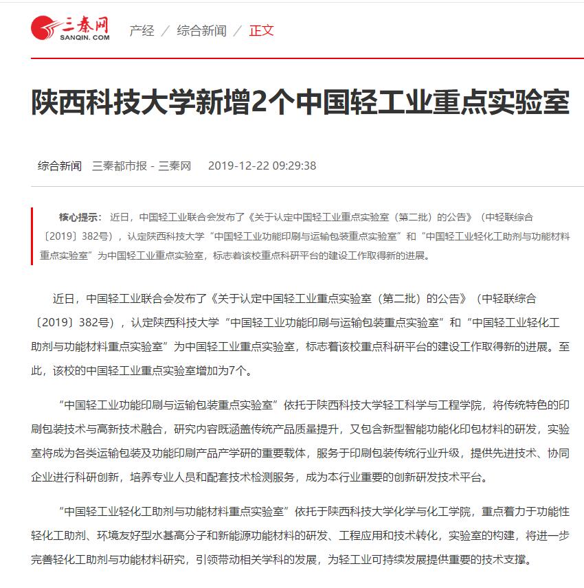 三秦網(wǎng):陜西科技大學(xué)新增2個(gè)中國輕工業(yè)重點(diǎn)實(shí)驗(yàn)室