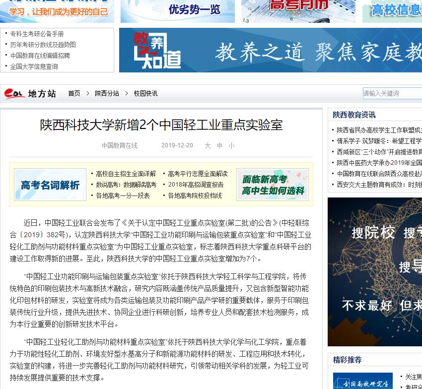 中國教育在線:陜西科技大學(xué)新增2個(gè)中國輕工業(yè)重點(diǎn)實(shí)驗(yàn)室