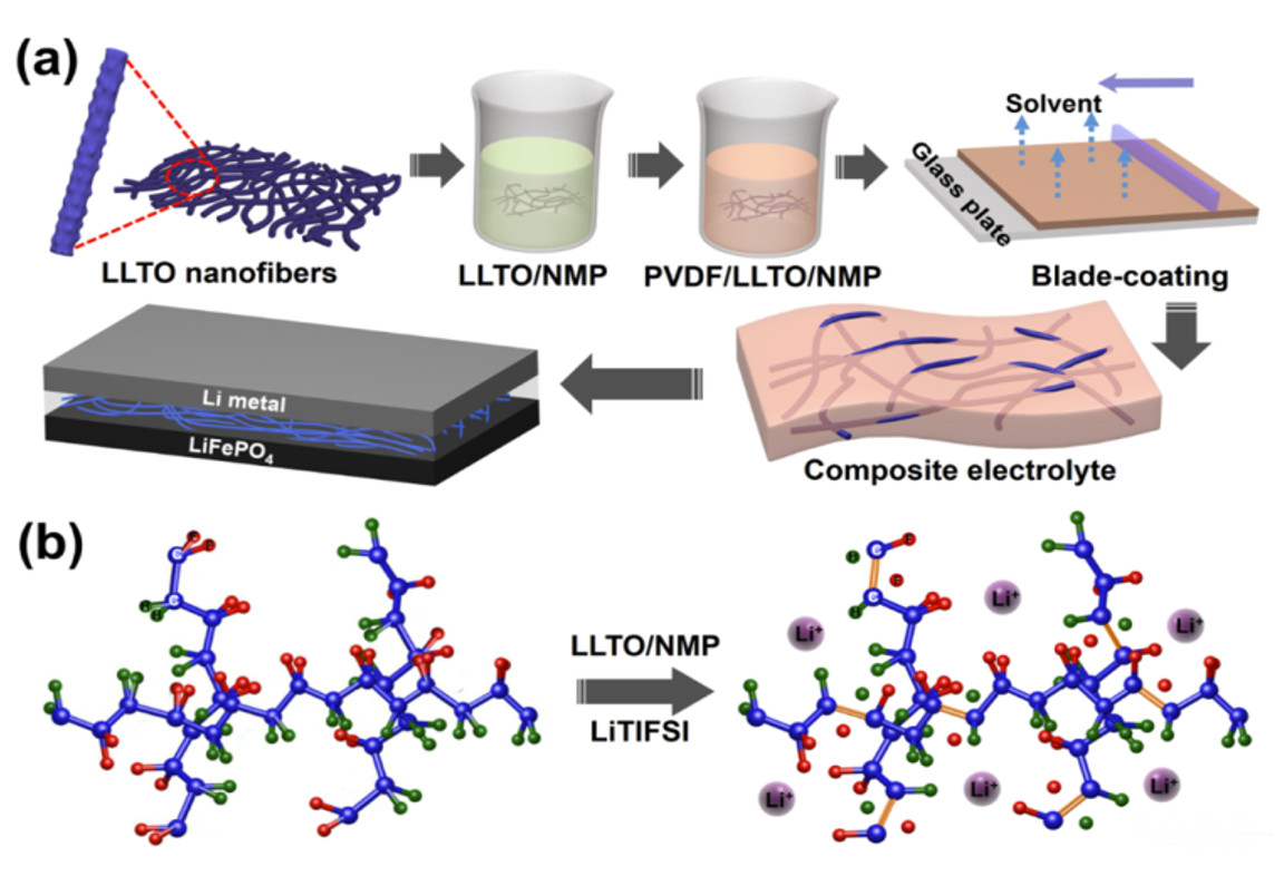 蘇慶梅和杜高輝教授針對金屬鋰具有高的活性,與電解液會發生副反應,在電化學循環中容易損耗,導致較低的庫倫效率;且在反復沉積/剝離過程中,鋰枝晶生長刺穿隔膜引發電池內部短路、熱失控,甚至發生起火爆炸等問題,構筑了無機陶瓷和有機聚合物互嵌的雙連續結構復合固態電解質,提高了離子電導率、抑制了鋰枝晶的生長、改善了鋰金屬電池的性能。利用涂覆法室溫下構筑了Li0.35La0.55TiO3納米線填充PVDF復合固態電解質,該復合電解質具有較高的室溫離子電導率、較寬的電化學窗口和高的機械性能,相關成果以“Li0.35La0.55TiO3Nanofibers Enhanced Poly(vinylidene fluoride)-Based Composite Polymer Electrolytes for All-Solid-State Batteries”為題發表在期刊ACS Appl. Mater. & Interface(IF=8.758)(https://doi.org/10.1021/acsami.9b14824)上。