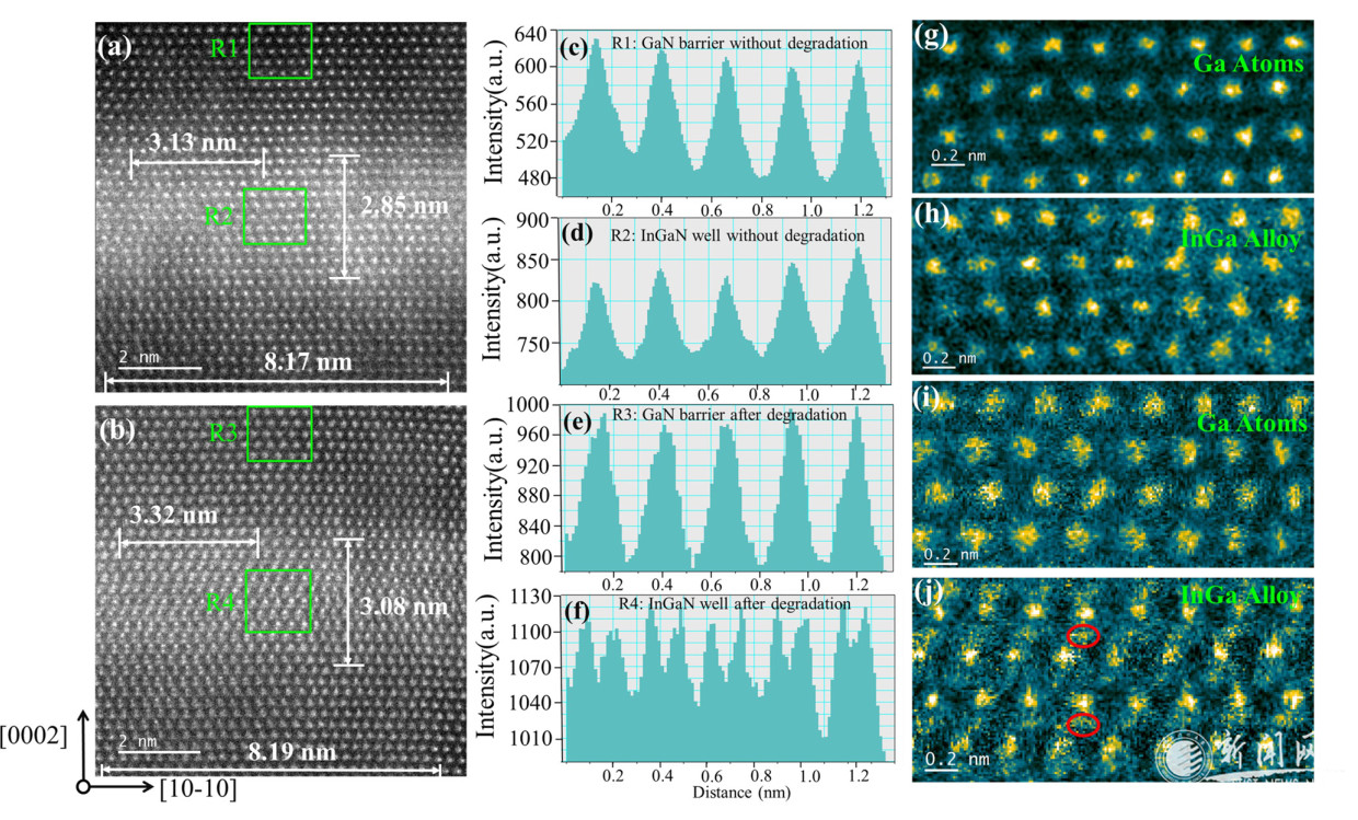 馬淑芳教授利用變溫微區光致發光譜儀(PL)和球差校正電子顯微鏡(ACTEM)分析了GaN基綠光LED老化后發光性能和有源區微觀結構的變化。PL結果表明,老化后GaN基LED的發光強度下降36.8%且峰值波長藍移1.6nm;STEM觀察進一步發現了老化后InGaN量子阱中出現In間隙原子,InGaN量子阱的馳豫度達80%。結合HRXRD結果以及DFT計算,老化后GaN基綠光LED發光性能下降是由于點缺陷密度的增加、量子限制效應減弱以及量子限制斯塔克效應增強導致。本項工作利用ACTEM直接觀察到In間隙原子,揭示了點缺陷對GaN基綠光LED發光性能的影響機制。相關成果發表在國際知名期刊Appl. Phys. Lett.(IF= 3.597)(https://doi.org/10.1063/5.0021659)上。