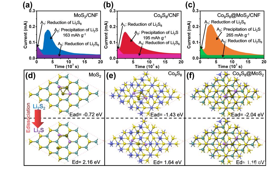 Li2S的成核實驗結果及Li2S2在不同功能層結合能和解吸能的DFT計算結果