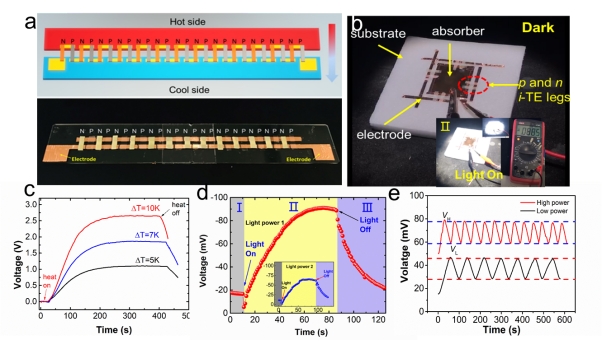 研究人員開發(fā)了基于離子熱電效應的無接觸式自供電熱智能探測器,在較寬的光、熱刺激范圍內展現(xiàn)出優(yōu)異的響應特性、可重復性和高靈敏度。同時,研究人員開發(fā)出由13對P-N熱電臂組成的平面式熱傳感器,該傳感器在10K溫差下可產生2.5V電壓且具備高穩(wěn)定性。