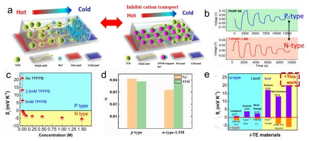 (a) P-N型轉換調控示意圖,(b)電壓響應方向對比圖,(c)P型至N型塞貝克系數(shù)變化圖,(d)P型和N型離子產生熵變圖,(e)已報道的P-N型塞貝克系數(shù)范圍對比圖。
