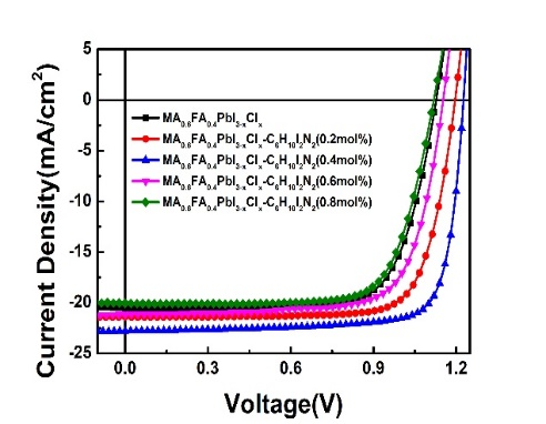 圖1.MA0.6FA0.4PbI3-xClx-C6H10I2N2的結構示意圖(a),不同DD比例與0.4mol%比例下MA0.6FA0.4PbI3-xClx的J-V曲線(b)
