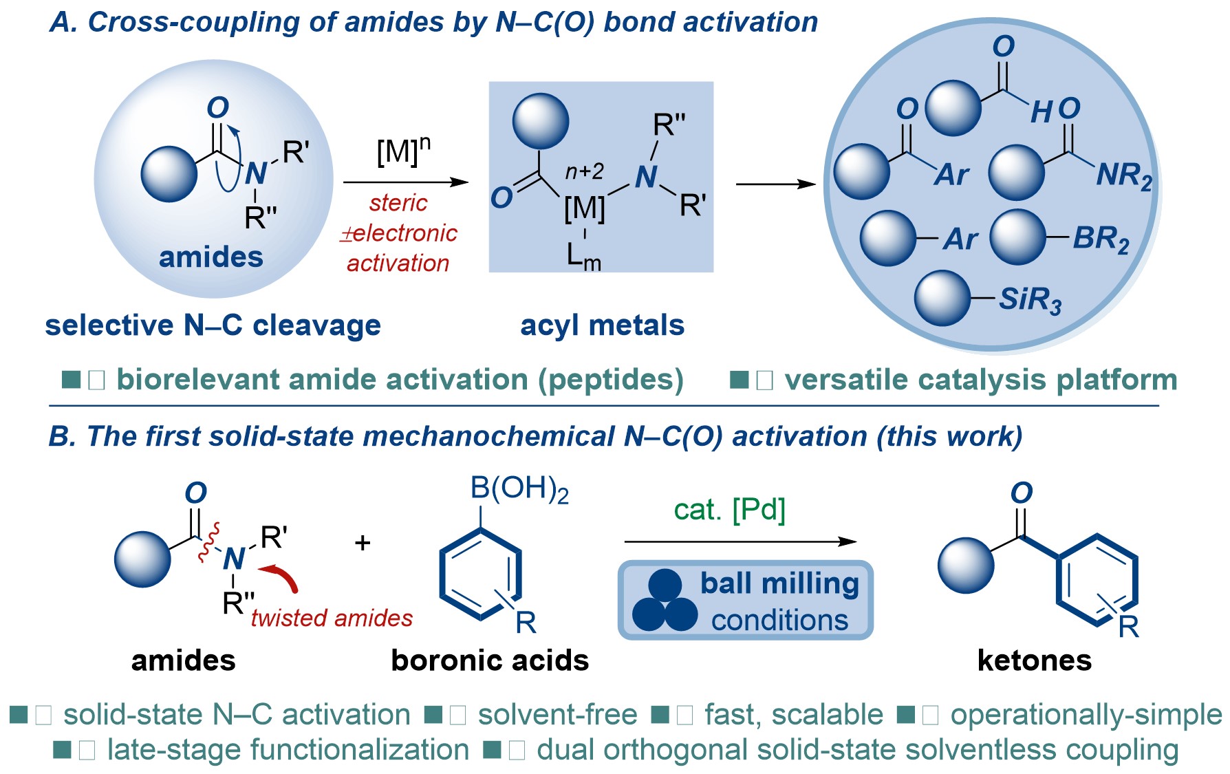 “Mechanochemical Solvent-Free Suzuki–Miyaura Cross-Coupling of Amides via Highly Chemoselective N–C Cleavage首次將機械化學方法應用于碳氮鍵選擇性斷裂的Suzuki-Miyaura交叉偶聯反應。反應過程不需要任何有機溶劑與額外加熱,后處理簡單,反應高效,并可用于醫藥中間體的合成、復雜藥物的后期修飾與機械化學條件下的串聯偶聯反應。本研究不僅豐富了酰胺鍵的活化反應研究,而且為有機合成化學中惰性化學鍵的活化反應提供了新思路。