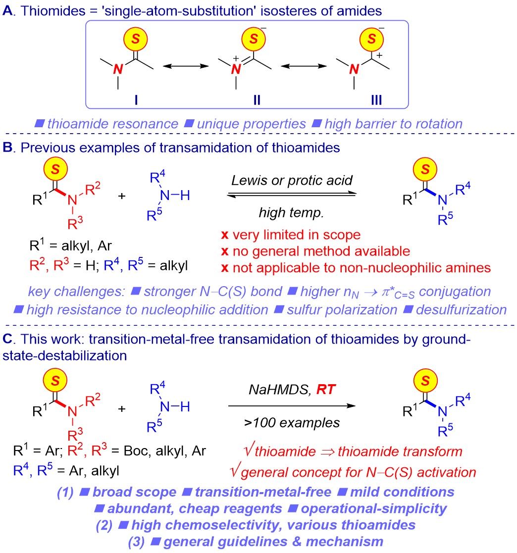 “Chemoselective Transamidation of Thioamides by Transition-Metal-Free N–C(S) Transacylation”首次提出了硫代酰胺的“基態去穩定化”(ground-state-destabilization)策略,實現了在藥學、生物學領域有著廣泛應用的硫代酰胺的轉胺化反應。該方法不僅避免了毒性過渡金屬催化劑的使用,而且有著廣泛的底物適用范圍(>100個底物)。為了進一步厘清硫代酰胺轉胺化的反應機理,該論文還通過密度泛函理論對反應過程進行了探討。