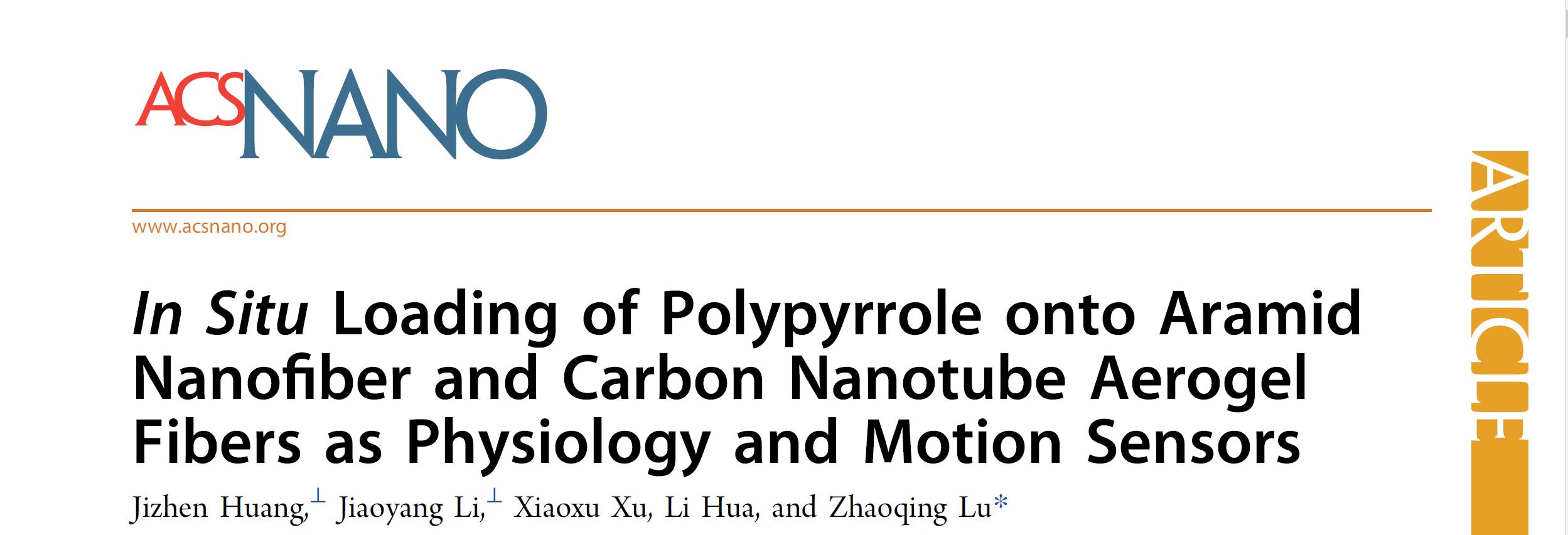 近日,我校輕工科學與工程學院陸趙情教授團隊在國際材料領域頂級期刊《ACS Nano》(IF=15.881)上發表題為“In Situ Loading of Polypyrrole onto Aramid Nanofiber and Carbon Nanotube Aerogel Fibers as Physiology and Motion Sensors”的研究論文。該研究涉及柔性電子技術與人機交互領域,為芳綸纖維在柔性可穿戴電子設備的應用上提供支撐,擴寬了我校高性能纖維材料信息化和輕質化的發展方向。我校為論文的唯一通訊單位,博士生黃吉振為第一作者,陸趙情教授為通訊作者。