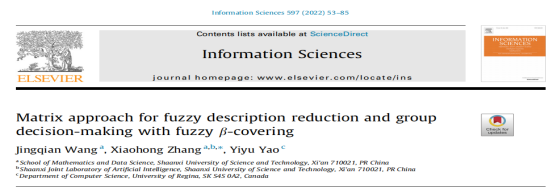 [2]Jingqian Wang, Xiaohong Zhang*, Yiyu Yao, Matrix approach for fuzzy description reduction and group decision-making with fuzzy β-covering, Information Sciences, 2022, 597: 53-85.