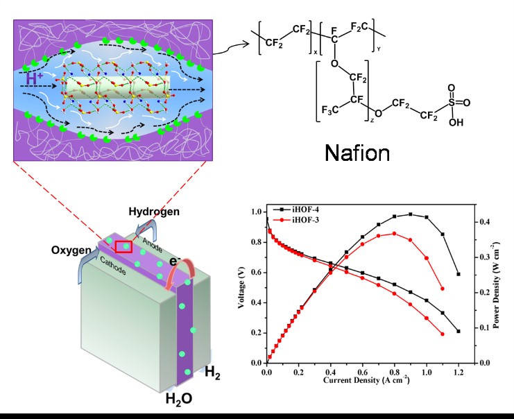 我校化學與化工學院曹麗慧教授開展的研究工作利用酸性與堿性有機分子構筑酸堿對的原理制備雙組分離子型HOFs材料,通過離子交換反應制備了具有DBpy·2I和萘二磺酸化合物的四種雙組分離子型HOF。研究結果表明,具有不同磺酸基配體位置的四種iHOF顯示出四種不同的氫鍵結構。阻抗譜測量表明,iHOF-3和iHOF-4的質子電導率可以分別達到1.16 × 10-3和2.76 × 10-3S·cm-1。iHOF/Nafion復合膜作為固體電解質的燃料電池測試初步研究表明,6%-iHOF-4/Nafion的最大功率密度可達到0.42 W·cm-2,6%-iHOF-3/Nafion可達到0.36 W·cm-2。隨著對此類材料的進一步研究,將會設計出更多具有高質子傳導性的iHOFs,這將在燃料電池領域顯示出巨大的潛力。
