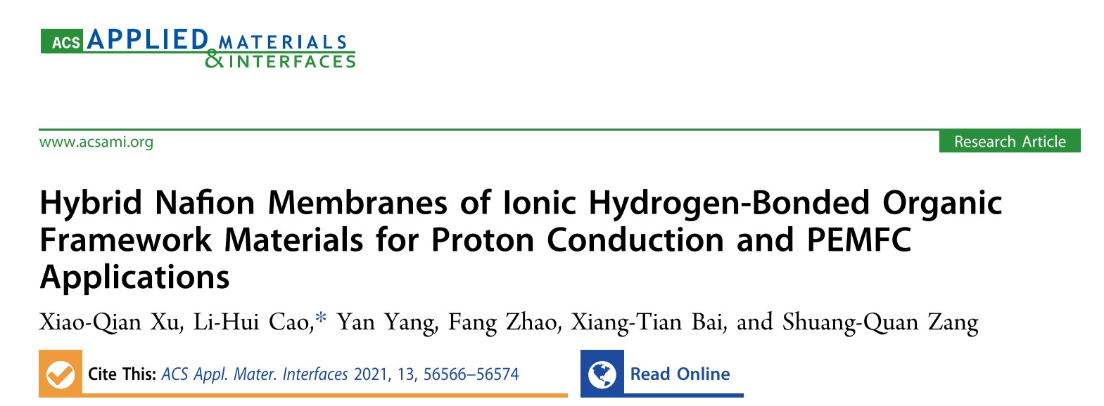 相關成果以“Hybrid Nafion Membranes of Ionic Hydrogen-Bonded Organic Framework Materials for Proton Conduction and PEMFC Applications”為題,發表在ACS Applied Materials & Interfaces(IF = 10.383)上。陜西科技大學為論文第一通訊單位,化工學院2018級碩士研究生徐小倩為該論文的第一作者,曹麗慧教授為第二作者和論文唯一通訊作者。