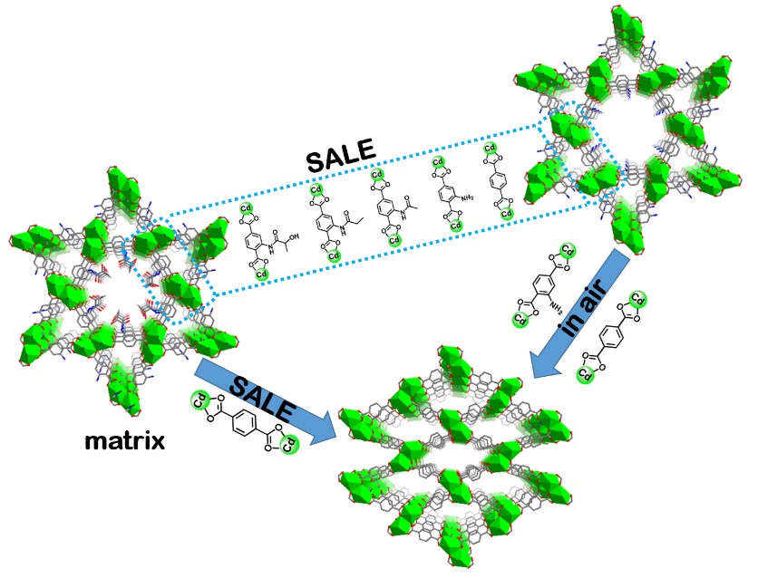金屬有機框架(MOF)作為一類功能性多孔晶態框架材料,由于其可控的結構和潛在的應用,引起了人們的廣泛關注。其結構的修飾與改良,性質功能的調控和提升一直是該領域的研究重點。近幾年科學家們開發了一種通過逐步反應實現配位聚合物多功能化的復雜合成策略——溶劑輔助連接體交換(SALE)。溶劑輔助連接體交換是指將配位聚合物作為母體加入到含有高濃度的外加有機配體溶液中反應,外加配體替換原配合物中的配體形成與母體具有相似框架的產物。通過合成后修飾(PSM)策略可以合成更復雜和多功能化的MOF材料。此外,由于其獨特的物理化學性能與結構息息相關,MOF材料在外部條件的刺激下可能會發生結構轉變。作為研究結構改變引起性能變化的理想模型,功能性晶態框架MOF材料在光、熱、壓力或pH值等外部刺激作用下結構和性質上的開關行為吸引了科學家們越來越多的關注。