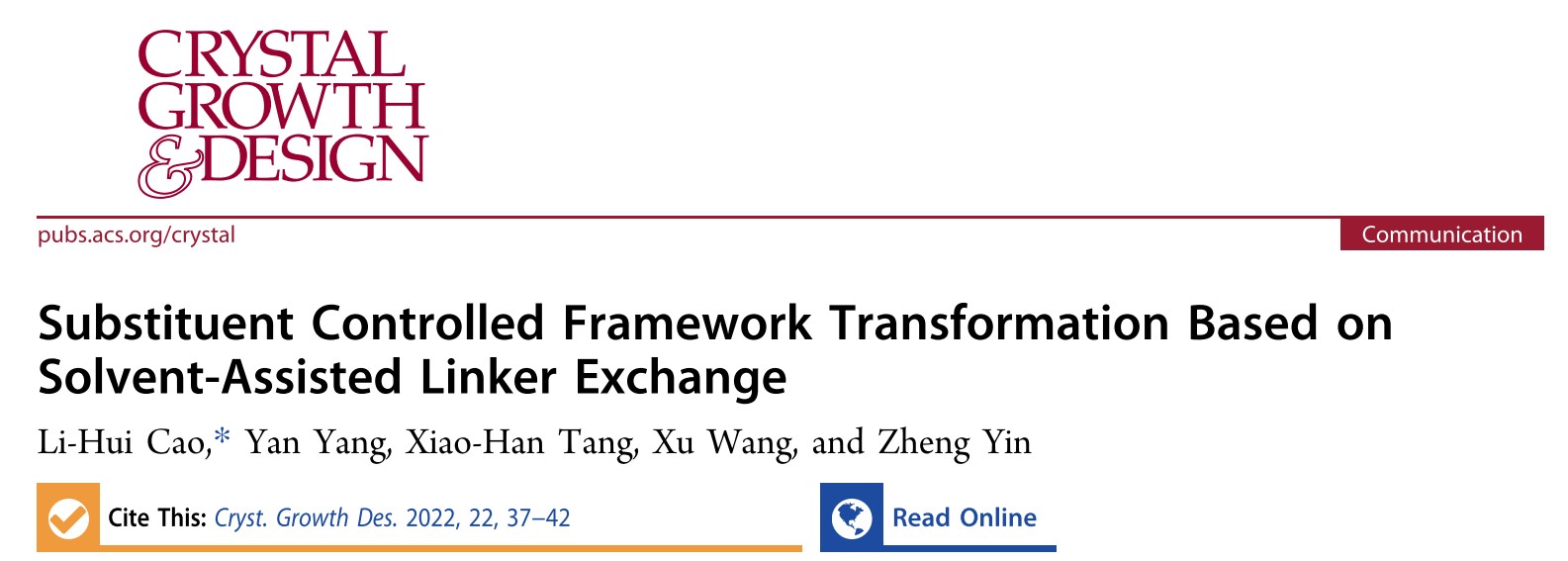 相關成果以“Substituent Controlled Framework Transformation Based on Solvent-Assisted Linker Exchange”為題,發表在Crystal Growth & Design上(IF = 4.010)上。陜西科技大學為論文唯一通訊單位,曹麗慧教授為第一作者和論文唯一通訊作者,化工學院2019級碩士研究生楊妍為該論文的第二作者。