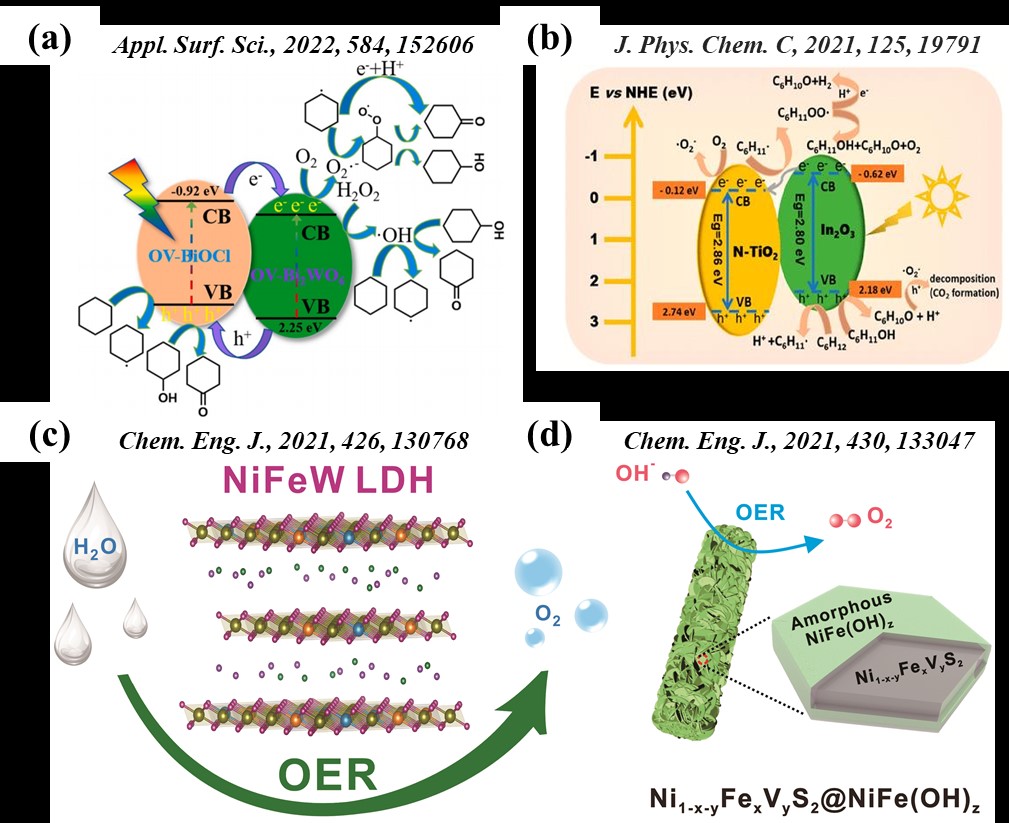 圖2 環己烷氧化體系開發:(a)Bi2WO6/BiOCl光催化環己烷氧化制KA油;(b)In2O3/N-TiO2光催化環己烷氧化高選擇性制環己酮。電解水體系開發:(c)NiFeW LDH作為OER反應的高效電催化劑;(d)核殼Ni1-x-yFexVyS2@NiFe(OH)z作為OER反應的高效電催化劑