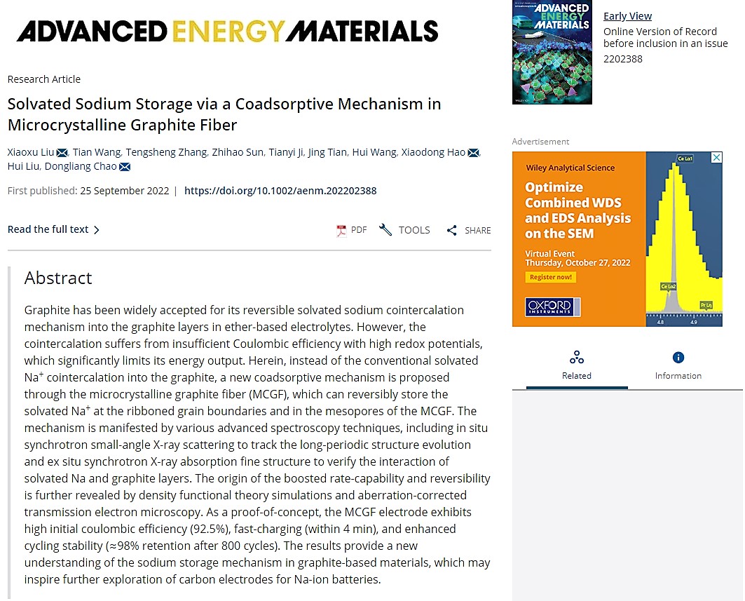 我校材料科學與工程學院(文物保護科學與技術學院)納米材料與技術團隊劉曉旭教授近日在Wiley雜志社旗下的國際頂級期刊Advanced Energy Materials (影響因子29.6)發表題為“微晶石墨的共吸附儲鈉”的研究性論文(Solvated Sodium Storage via a Coadsorptive Mechanismin Microcrystalline Graphite Fiber),我校劉曉旭教授、郝曉東副教授與復旦大學晁棟梁教授為共同通訊作者,陜西科技大學為第一作者和第一通訊作者單位,該論文的發表極大地提高了我校在碳基能源材料領域的國際影響力。