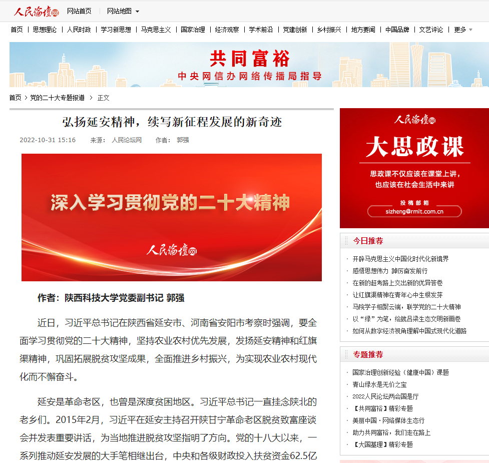 近日,人民論壇網(wǎng)“黨的二十大專題報道”刊發(fā)我校黨委副書記郭強的理論文章《弘揚延安精神,續(xù)寫新征程發(fā)展的新奇跡》。