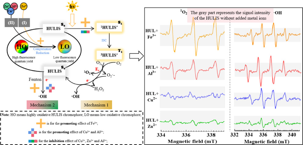 研究指出大氣PM2.5不僅影響人民身體健康,還會影響全球或區域性氣候。該項研究發現西安地區大氣PM2.5中含有豐富的溫室成分—類腐殖質物質(HULIS),它在各種微量組分金屬離子(特別是Fe3+離子)的脅迫下可以發生顯著的光學特性變化,不僅增強大氣PM2.5對氣候的增溫效應,還發現大氣PM2.5的光化學反應活性也明顯增強了(包括激活三線態、活性氧自由基反應),進而影響區域空氣質量。最后,作者圍繞這些發現提出了分子交互和自由基反應機制,以及潛在的領域影響。