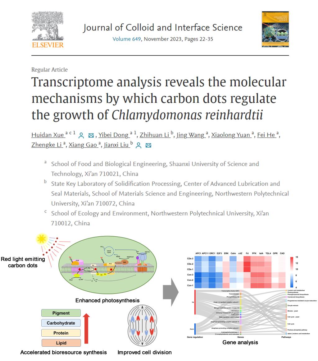 近日,食品科學與工程學院(生物與醫藥學院)藻類生物技術與綠色開發團隊在物理化學領域一區TOP期刊Journal of Colloid and Interface Science(Q1,IF:9.965)發表題為“Transcriptome analysis reveals the molecular mechanisms by which carbon dots regulate the growth of Chlamydomonas reinhardtii”的研究論文。薛惠丹副教授作為論文第一作者和第一通訊作者,研究生董益貝為共同第一作者,陜西科技大學為第一作者和第一通訊作者單位,西北工業大學劉建喜副教授為共同通訊。該研究涉及了材料學和微生物學交互領域,揭示了碳點調節微藻生物量的分子機制,研究結果為擴大納米材料在微藻類生產、未來農業和資源方面的應用提供了理論支持。